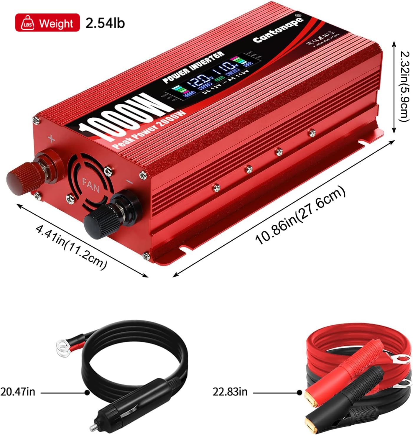 1000W CAR POWER INVERTER: The Cantonape Power Inverter offers a continuous DC to AC power supply of 1000W, convert power from 12V to 110V/120V, with a peak surge of 2000W during load startup. Featuring 2 AC outlets, 3.0A USB port and 20W Type-C Port for multi-purpose charging.