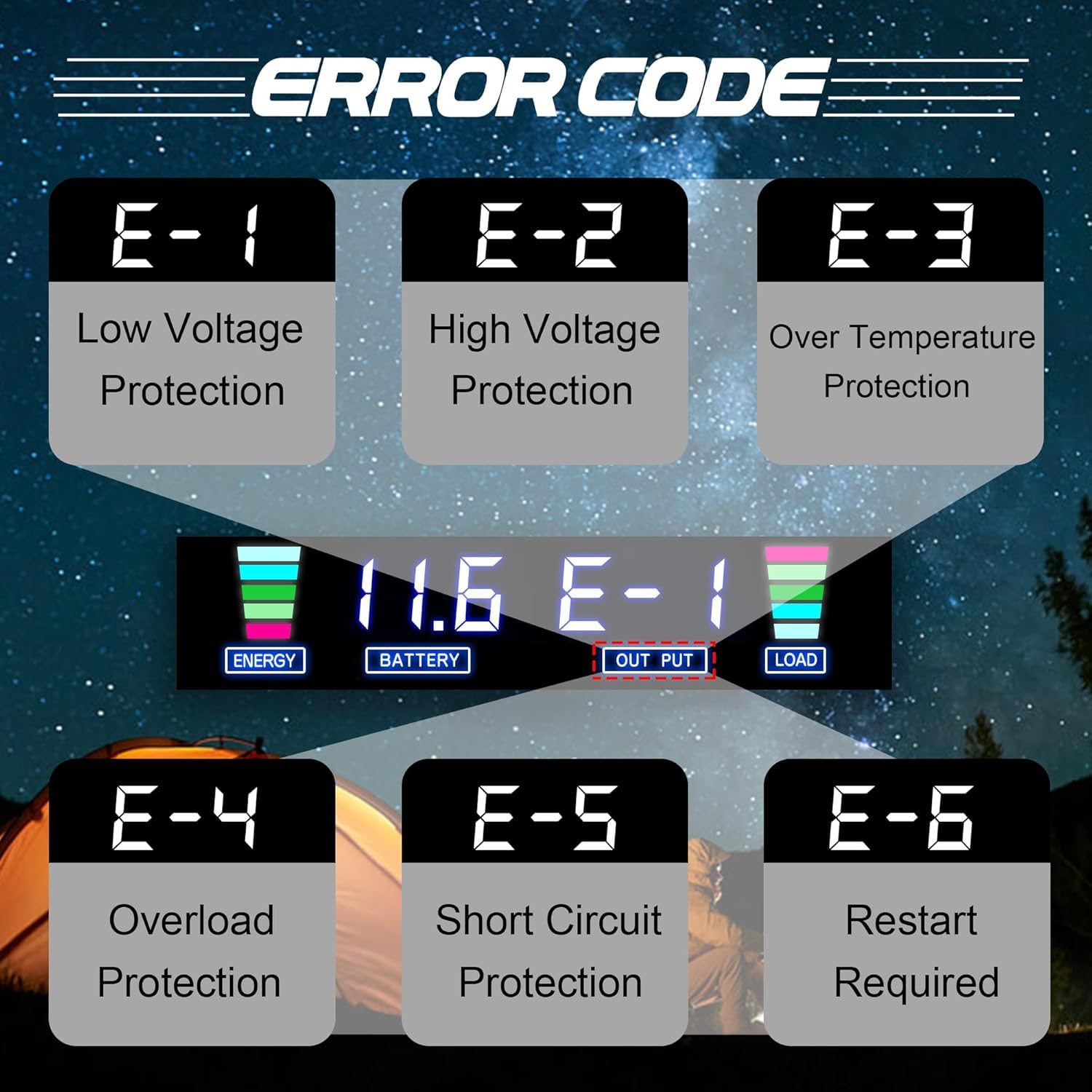INTELLIGENT LCD DISPLAY: In normal working state, the LCD Display will display the input/output voltage, battery capacity, load capacity and output frequency. When the inverter is in an abnormal state, the LCD Display will display the abnormal code. Such as, E-1: Low Voltage Protection, E-2: High Voltage Protection, E-3: Overtemperature Protection, E-4: Overload Protection, E-5: Short Circuit Protection, E-6: Repeated Faults Shutdown, Restart Required. You can troubleshoot the inverter based on these trouble codes.