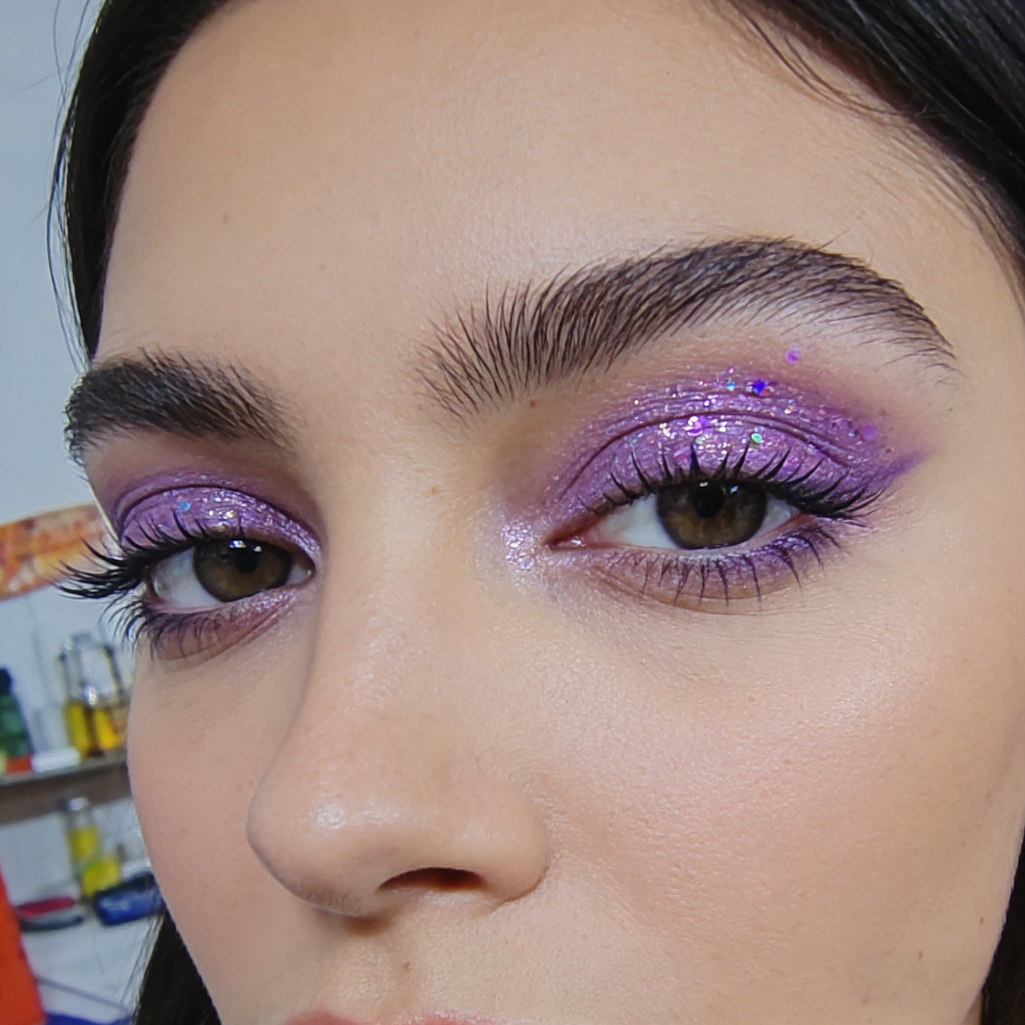 Light Purple Glitter Holographic Effect:This chunky glitter blends with plenty of different shapes and sizes of chunky and fine glitters in a gel base,great for a metallic coverage wtih a holographic effect.The mermaid sequin glitters have vibrant color,which shows up as an ultra-reflective and shiny sparking shimmer smear.