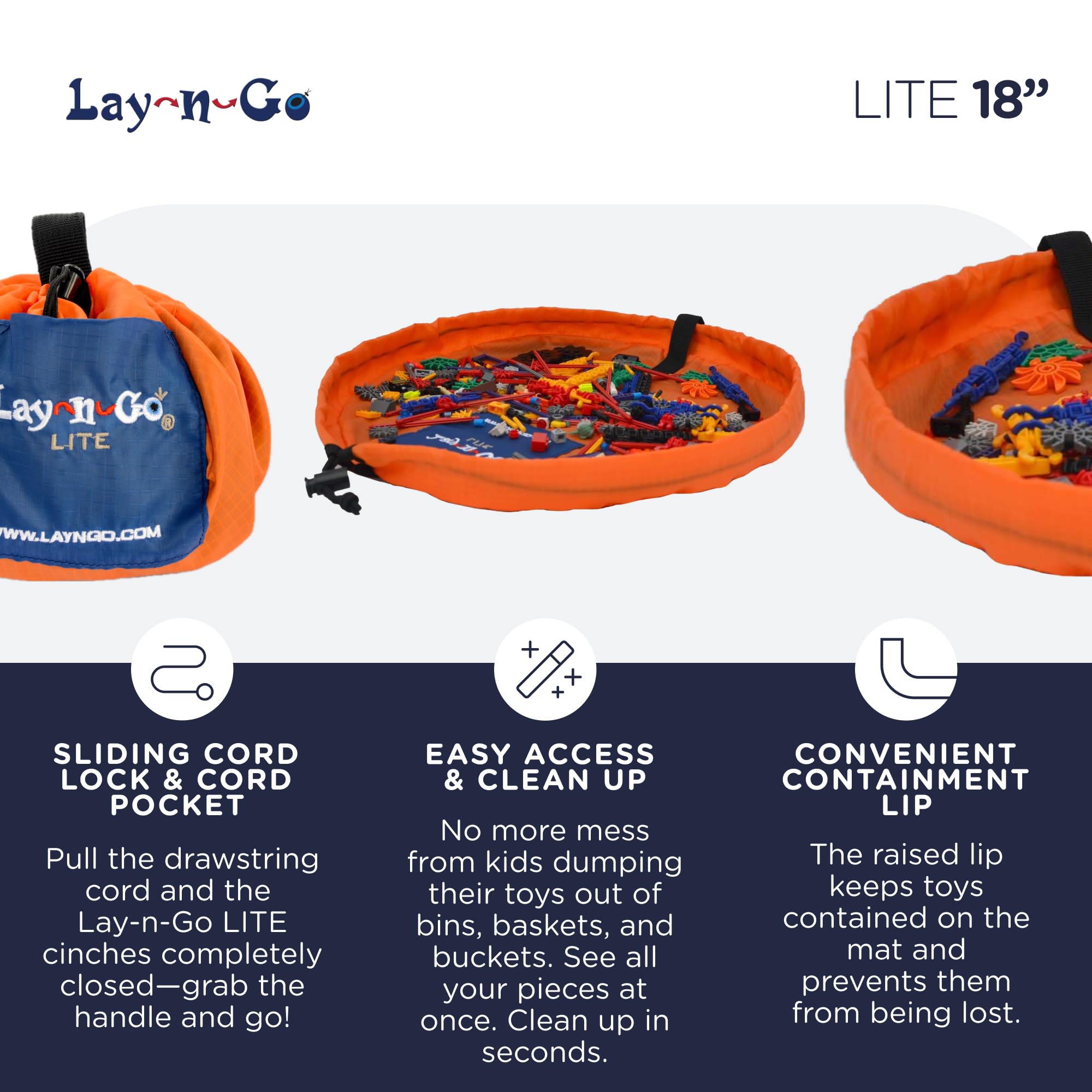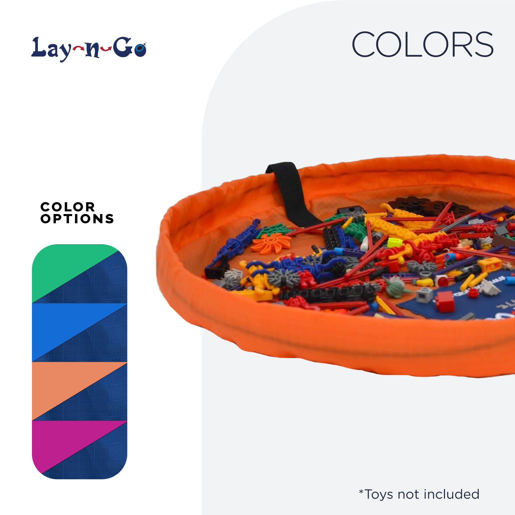 QUICK CLEANUP & EASY STORAGE: No more dumping toy bins and baskets. The Lay-n-Go 18” playroom toy organizer mat has a raised edge to keep your toys in place. Just pull the drawstring, and it turns into a bag that's easy to carry and store.