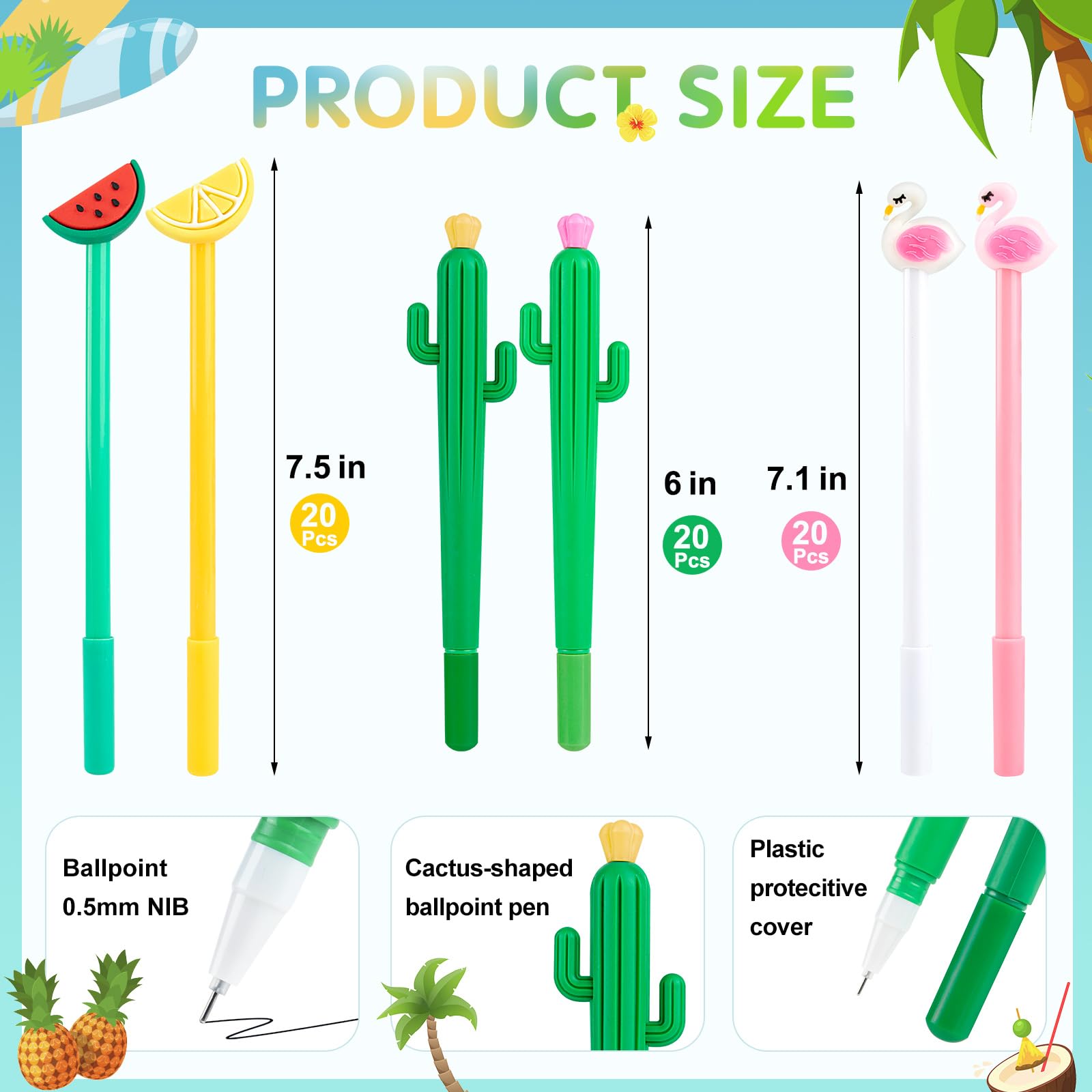 SUFFICIENT QUANTITY: The package contains a total of 60 pens in 4 different styles of fun, 20 cactus ballpoint pens, 20 flamingo ballpoint pens, 10 watermelon ballpoint pens and 10 lemon ballpoint pens. The quantity is enough to meet your various writing needs in daily life