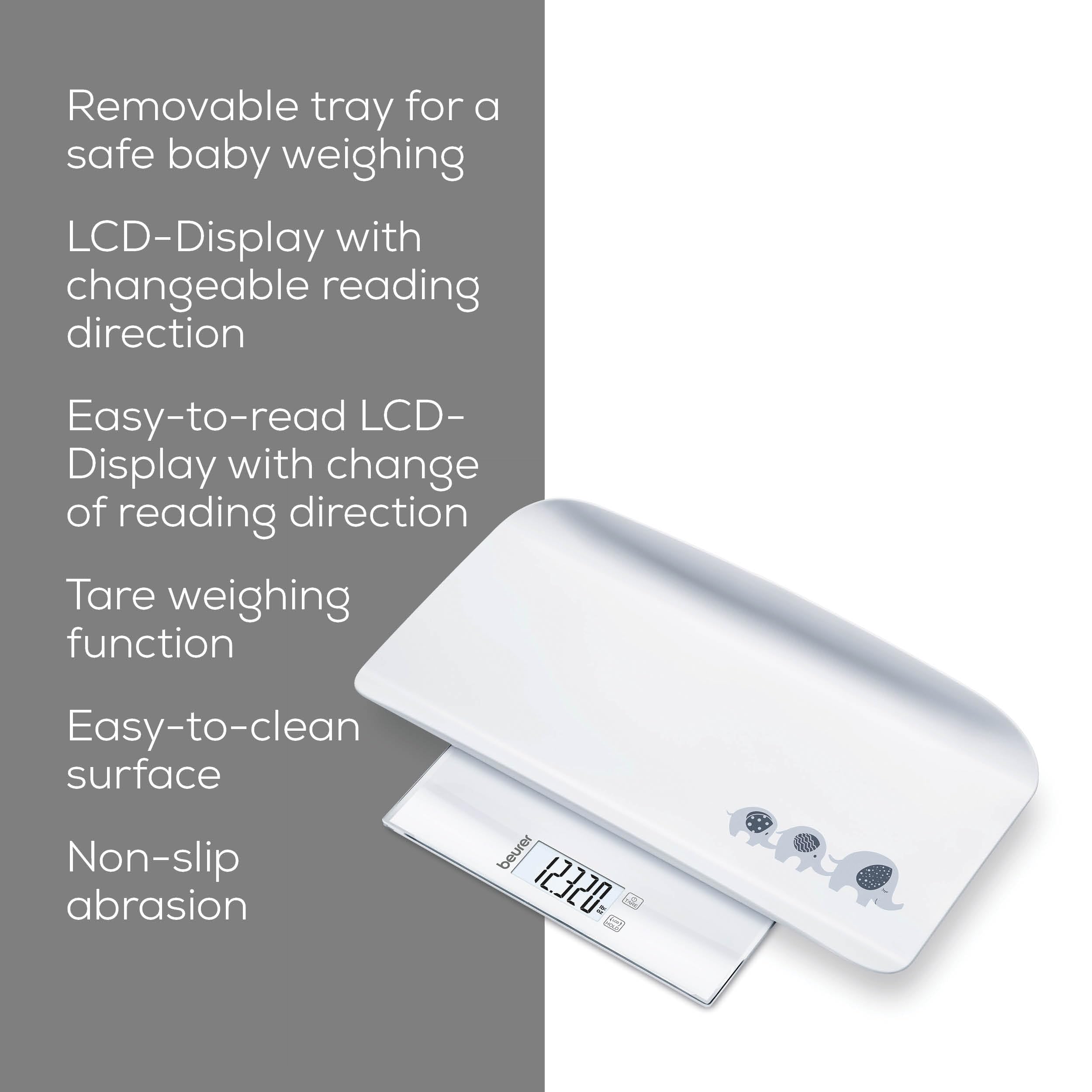 Beurer's BY82 Multifunctional Baby Scale is great for tracking body weight of all family members. Suitable for babies, pets, kids, toddlers, and adults with a 396lb weight capacity. The detachable tray slides on and off to easily swap between uses. The weight scale measures in 4 units: pounds, ounces, kilograms, and pounds & ounces together. A backlit, rotating display means the weight values can be viewed from any direction. The automatic hold function waits to measure until the scale detects stability. If your baby or small animal is extra wiggly, press the manual hold function when they have calmed. The tare function allows you to zero out the weight of a baby blanket or pet food before you weigh for more precise results. Non-slip, abrasion-resistant rubber feat mean the scale is stable and won’t scratch baby changing tables or counter tops. The smooth curved weighing tray gives an extra feeling of security and comfort. Easily wipe down the tray or surface of the glass scale when needed. Automatic shut off after 30 seconds with a gender neutral design makes BY82 a great addition to any nursery or home décor.