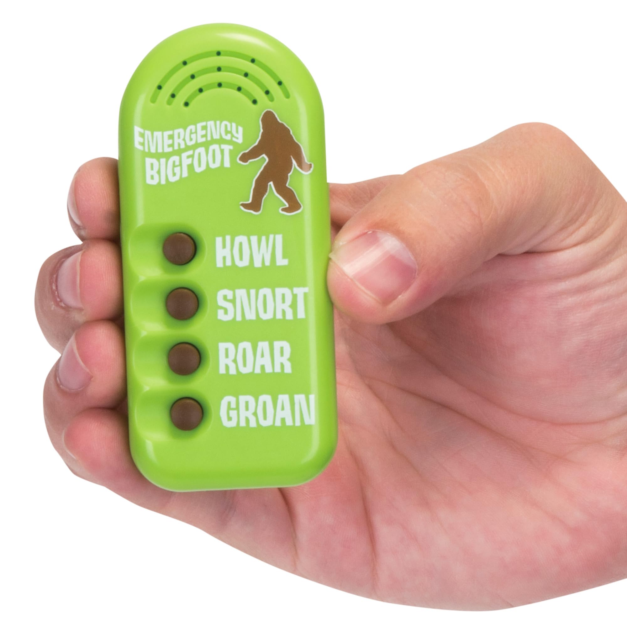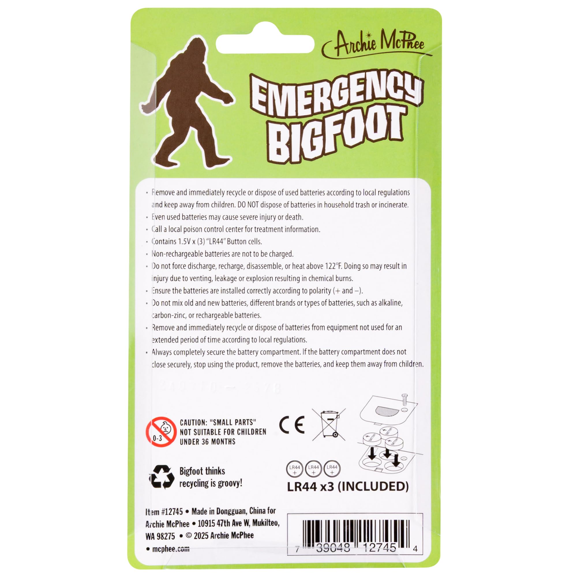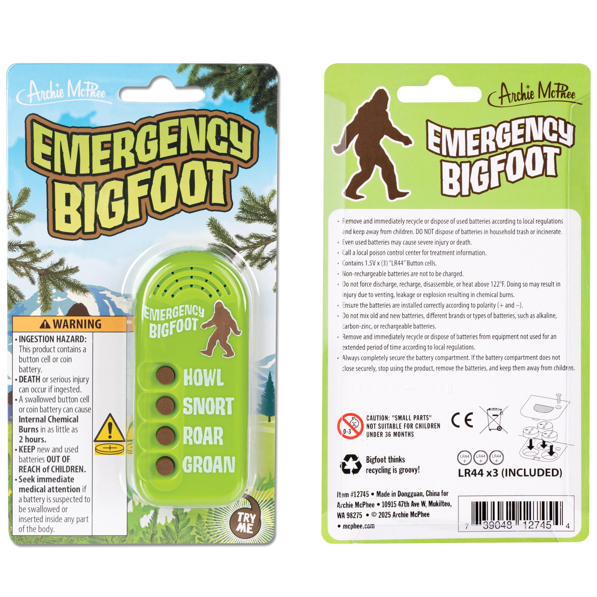 ACCOUTREMENTS: ARCHIE MCPHEE - EMERGENCY BIGFOOT - After countless alleged nights in tents and entirely plausible peanut-butter microphone experiments, the sounds of Sasquatch have finally been captured. This 3½" Electronic Emergency Bigfoot Noisemaker delivers four legendary calls, howl, snort, roar, and groan, at the press of a button. Ideal for camping trips, forest hikes, cryptid conventions, or startling unsuspecting friends behind shrubbery. Compact and portable, it lets you summon mysterious woodland vibes approximately every 20 minutes, as required by folklore. Includes three LR44 batteries, so you’re expedition ready immediately. Whether you’re a believer, skeptic, or enthusiastic howler, this device brings the legend to life — no blurry photos necessary. OVERVIEW: Features four Sasquatch-inspired sounds: howl, snort, roar, and groan. Compact 3½" size makes it ideal for camping or pranks. Easy push-button activation delivers legendary forest vibes instantly. Portable design fits easily in pockets or backpacks.