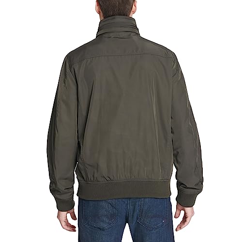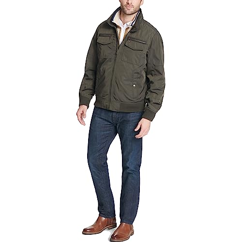 Description Poly twill four pocket performance mid-weight rib knit zip front bomber jacket with utility collar and hidden hood. Contrast quilted lining with light poly fill insulation.