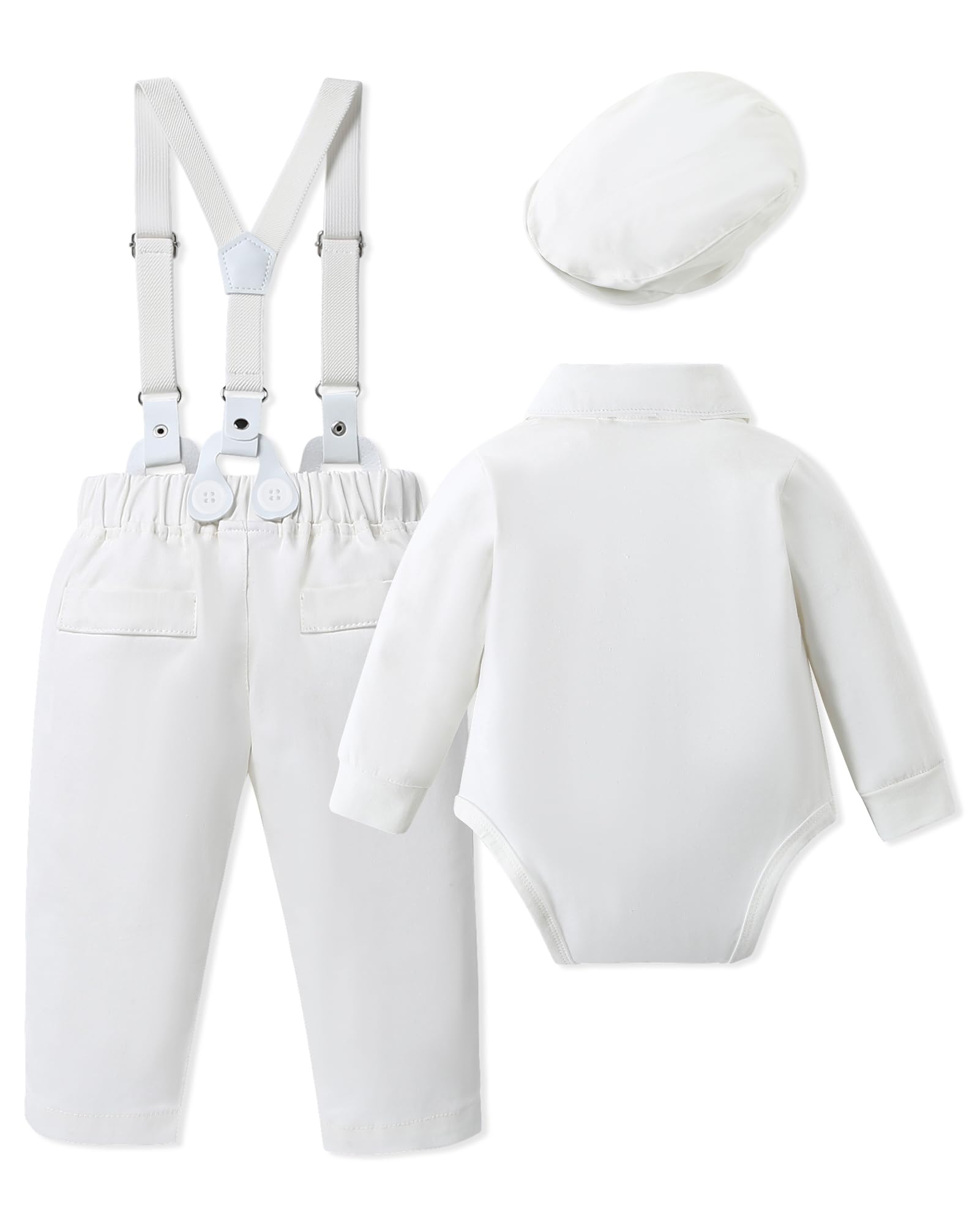 Package: Baby boys' pants sets include 1* long sleeves romper + 1* suspender pants + 1* beret hat. No special care is needed, but hand washing in cold water is more recommended