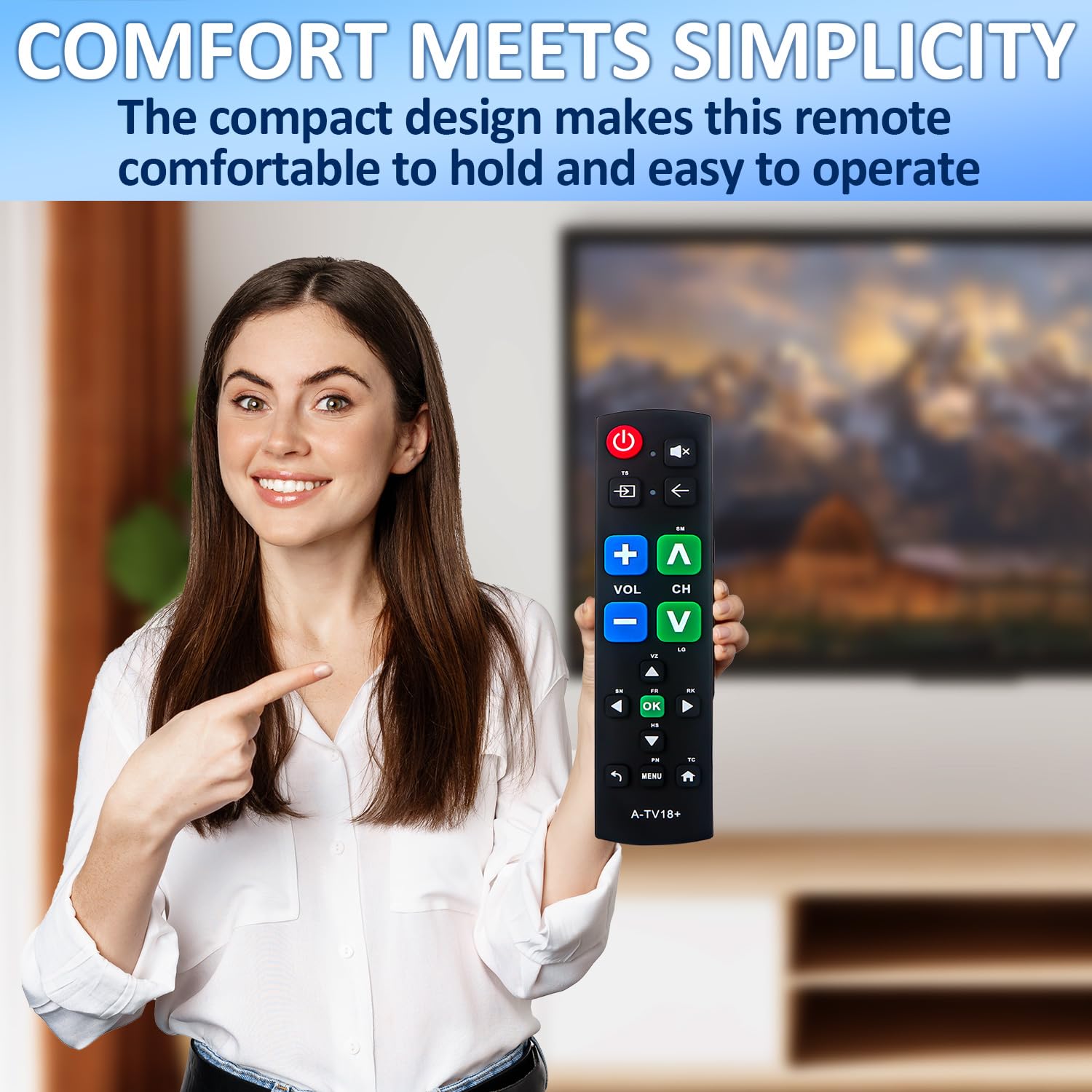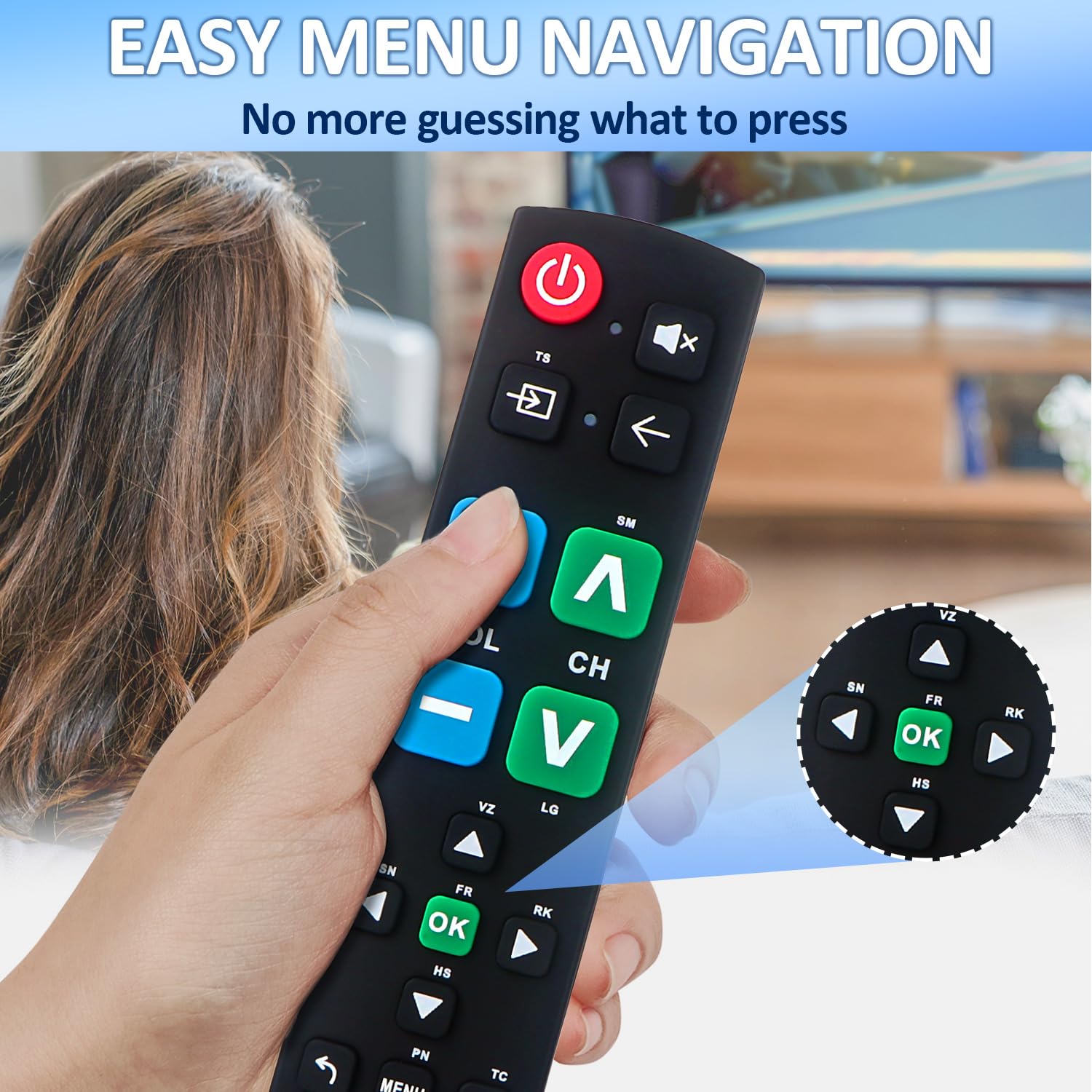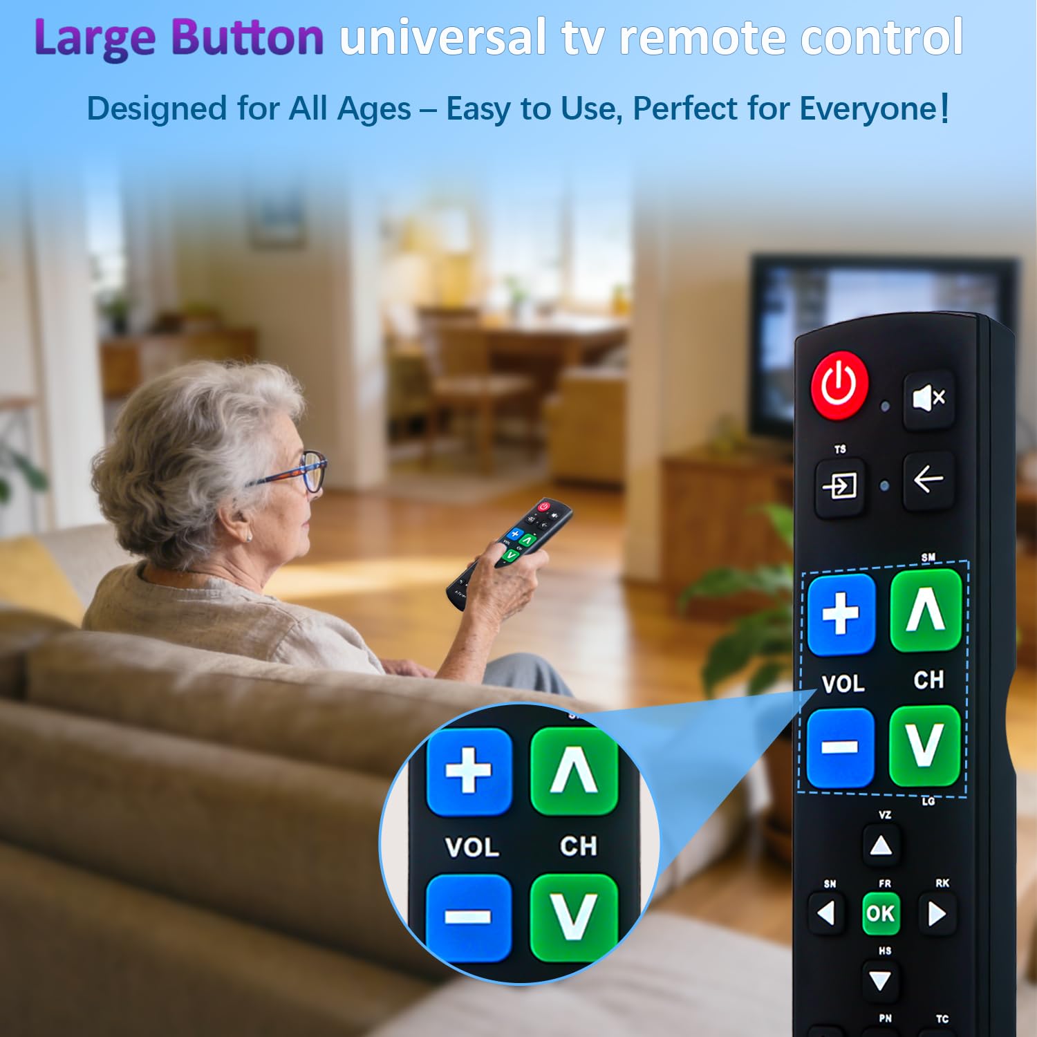 【Easy Big Button Design】The remote includes specialized features like an extra-large enter button, big button universal controls, and tactile feedback, catering specifically to seniors and those with limited dexterity or vision. It aims to provide a more comfortable and accessible user experience.
