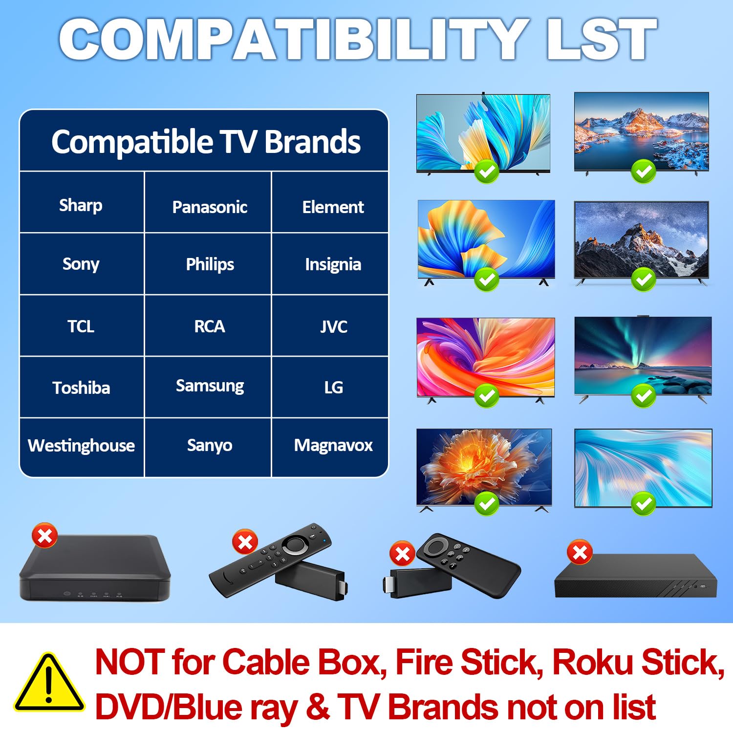【Compatible with All TVs】This universal remote control works with Samsung/LG/VIZIO/Sony/Hisense/Philips/Panasonic/Sharp TVs and more TVs. (Please note that this remote is NOT compatible with streaming devices, cable boxes, or unrelated TV platforms)
