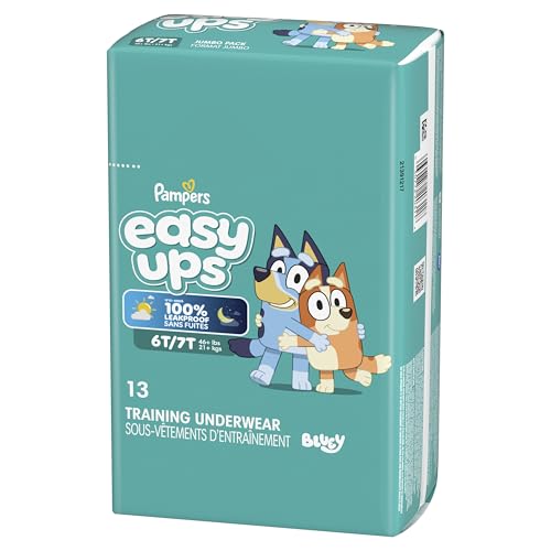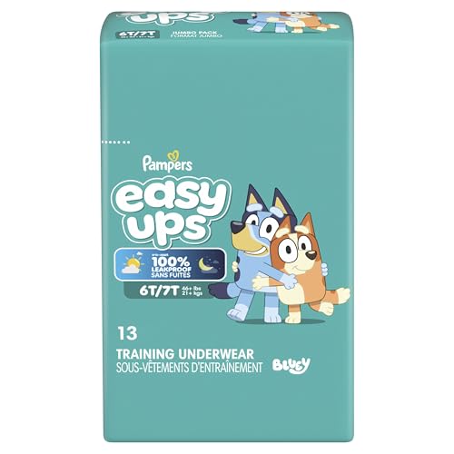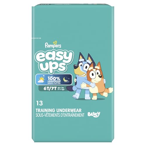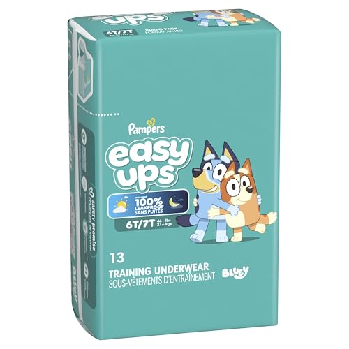 Ready to potty train with Bluey? Pampers Easy Ups Training Pants featuring Bluey makes it easy. They pair the feeling of real underwear with the protection of Pampers to make training easier for everyone. Give your child the confidence to take on potty training with a little more independence and a lot more fun. Easy Ups Training Pants feature stretchy sides and an underwear-like waistband for easy up and down, plus an ultra-absorbent core with LockAway Channel to help keep them dry day and night. With up to 2X better protection day and night*, Easy Ups deliver up to 100% leakproof protection. These hypoallergenic, dermatologist-approved training pants are made with 0% elemental chlorine, parabens, or latex** and backed by the Pampers Safety Promise. Fun Bluey designs motivate your toddler to potty train. Pampers Easy Ups are also available with Peppa Pig! Pair with Pampers Sensitive Wipes to help keep your toddler's skin healthy. Find your toddler's best fit in the following sizes: training pants 2T–3T (diaper size 4,15–34 lbs.), training pants 3T–4T (diaper size 5, 20–40 lbs.), training pants 4T–5T (diaper size 6, 23-50 lbs.), training pants 5T–6T (diaper size 7, 35–60 lbs.), training pants 6T–7T (diaper size 8, 46+ lbs.) *Urine leaks vs. leading competitor size 2T-3T ** No natural rubber