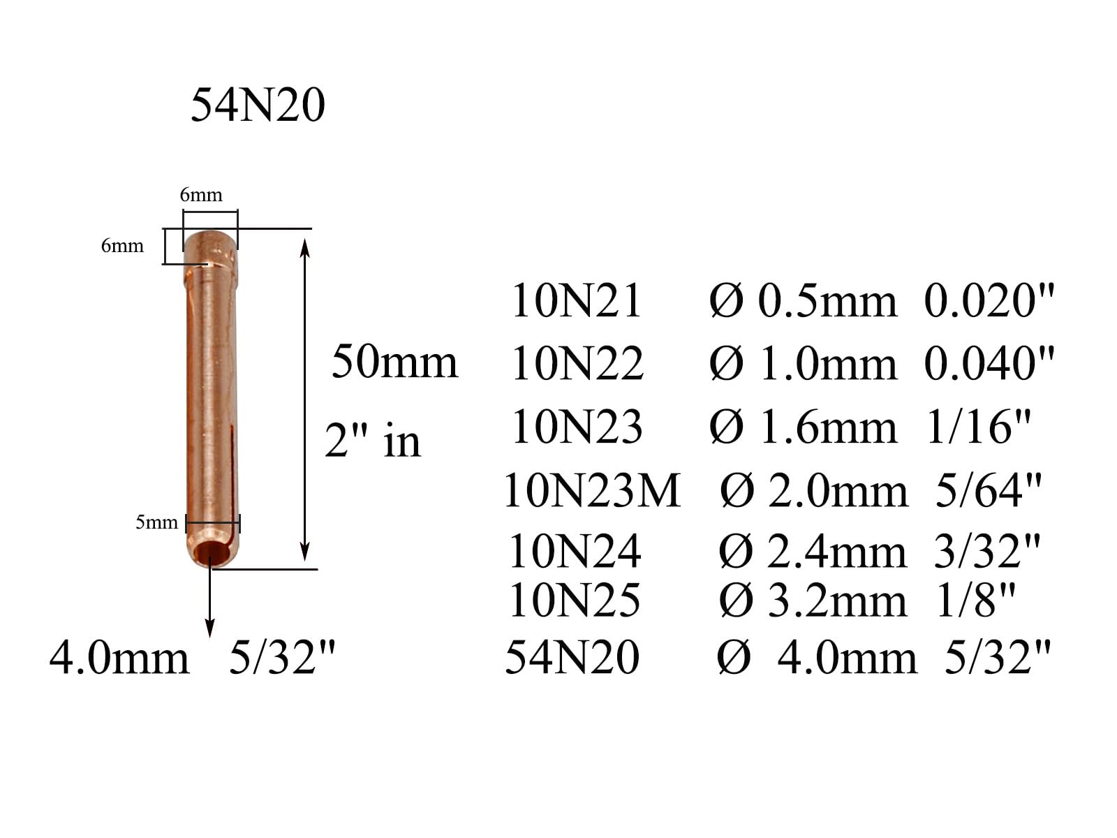 10pcs TIG Collets Ref No 10N25 ( 5/32“ & 4.00mm Orifice ) and Size: ( 5/32“ x 2" & 4.00mm x 50mm )