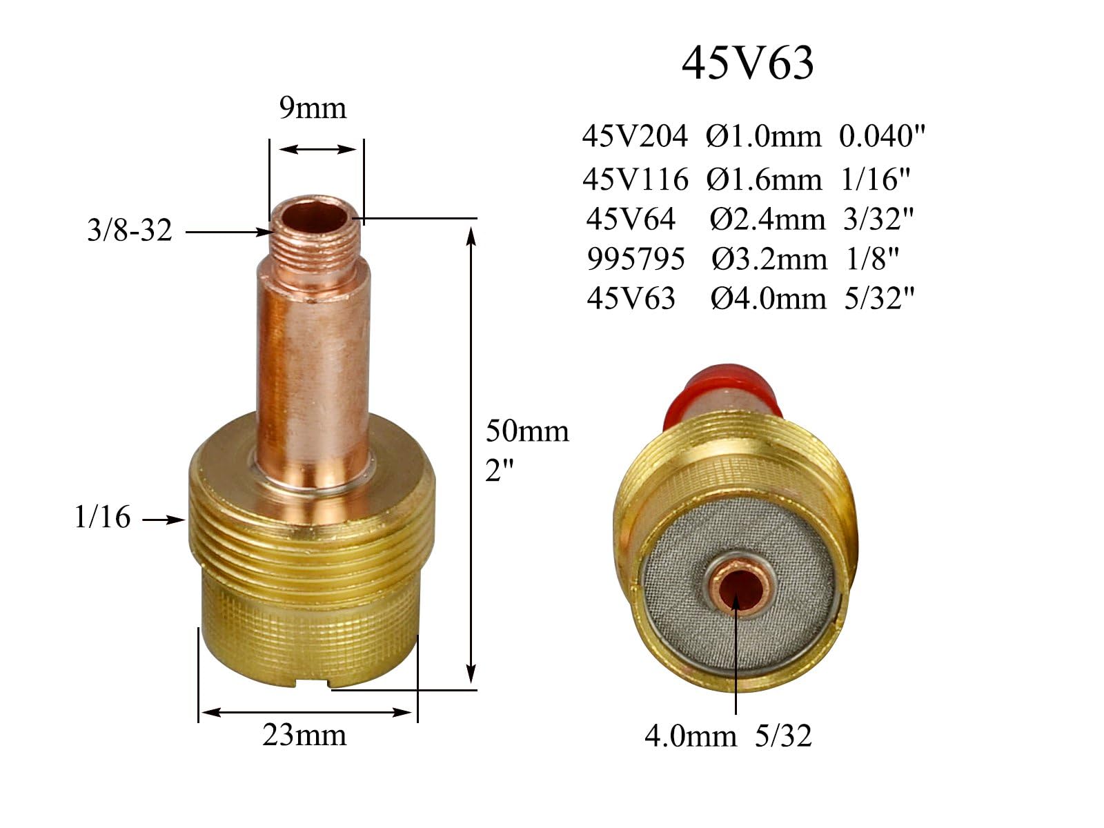 2pcs TIG Gas Lens Collet Bodies Ref No 45V63 ( 5/32“ & 4.00mm Orifice ) and Size: ( 5/32“ x 2" & 4.00mm x 50mm )