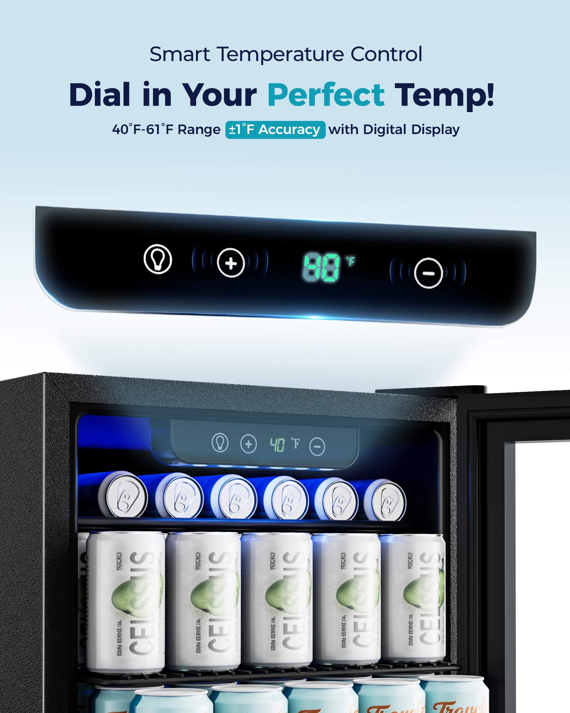 【SMART TOUCH & TEMPERATURE CONTRO】Our beverage cooler comes equipped with a user-friendly touch panel that allows for effortless temperature adjustment. You can customize the settings to your preference ranging from 40℉ to 61°F. With a gentle touch, LED lights illuminate your beverages, providing convenience for your Beer and Wine Chiller