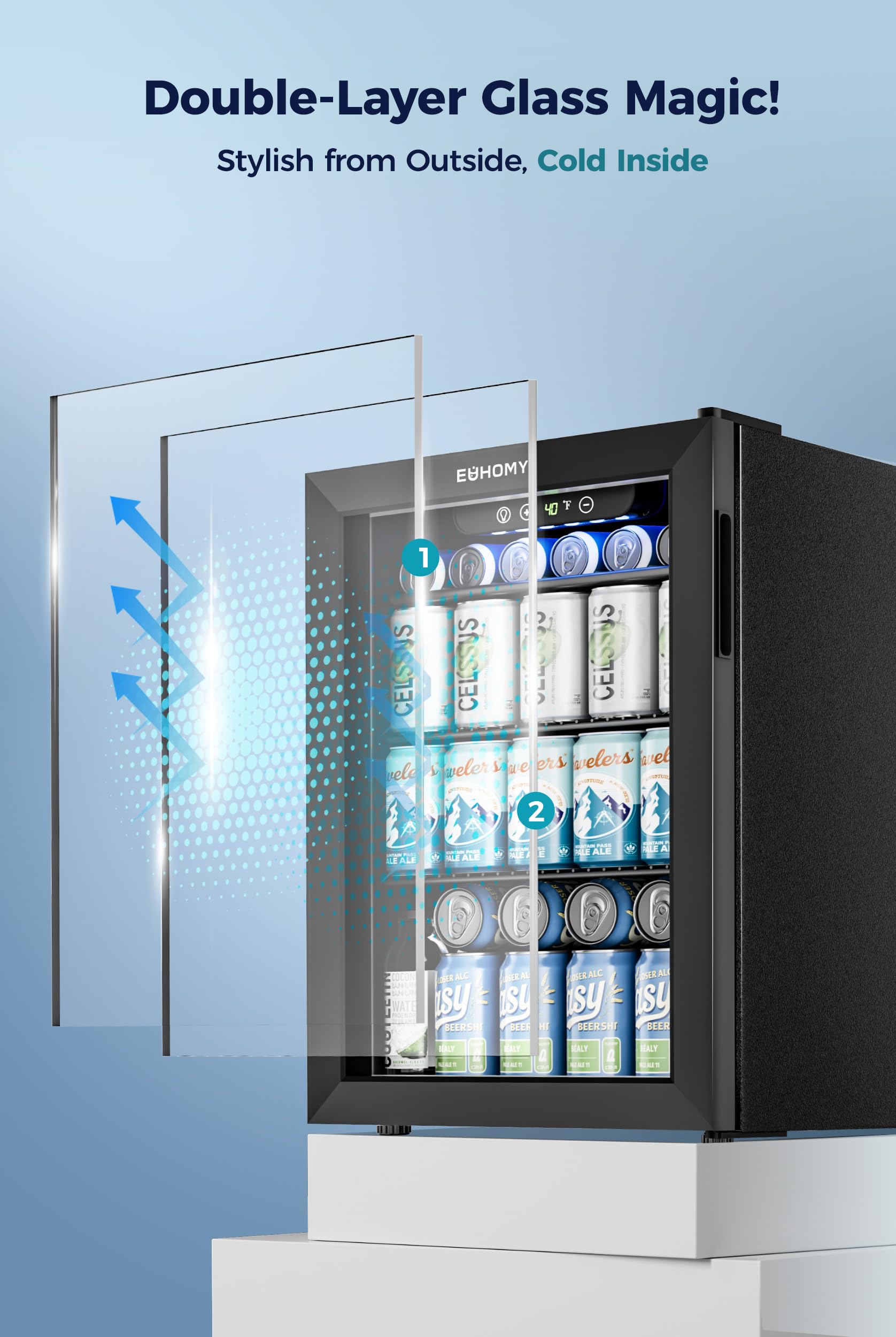 【FAST AIR COOLING TECHNOLOGY 】The Beverage Fridge with an energy-saving compressor, the compressor and circulating fan efficiently disperse cold air throughout the drink cooler. Noise can be controlled under 38 dB. The double-layered door efficiently blocks UV rays and the mini fridge's superior sealing ensures a constant internal temperature