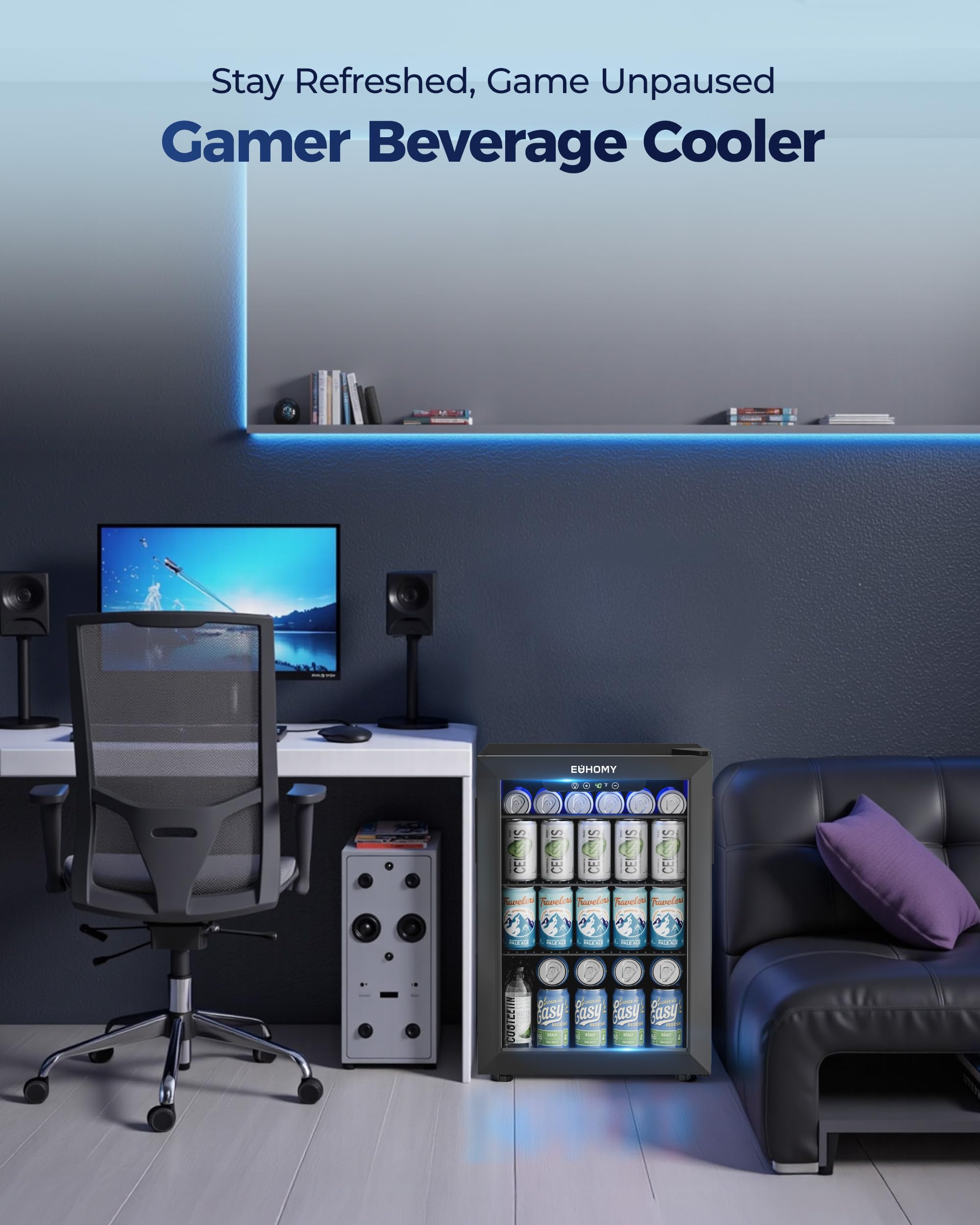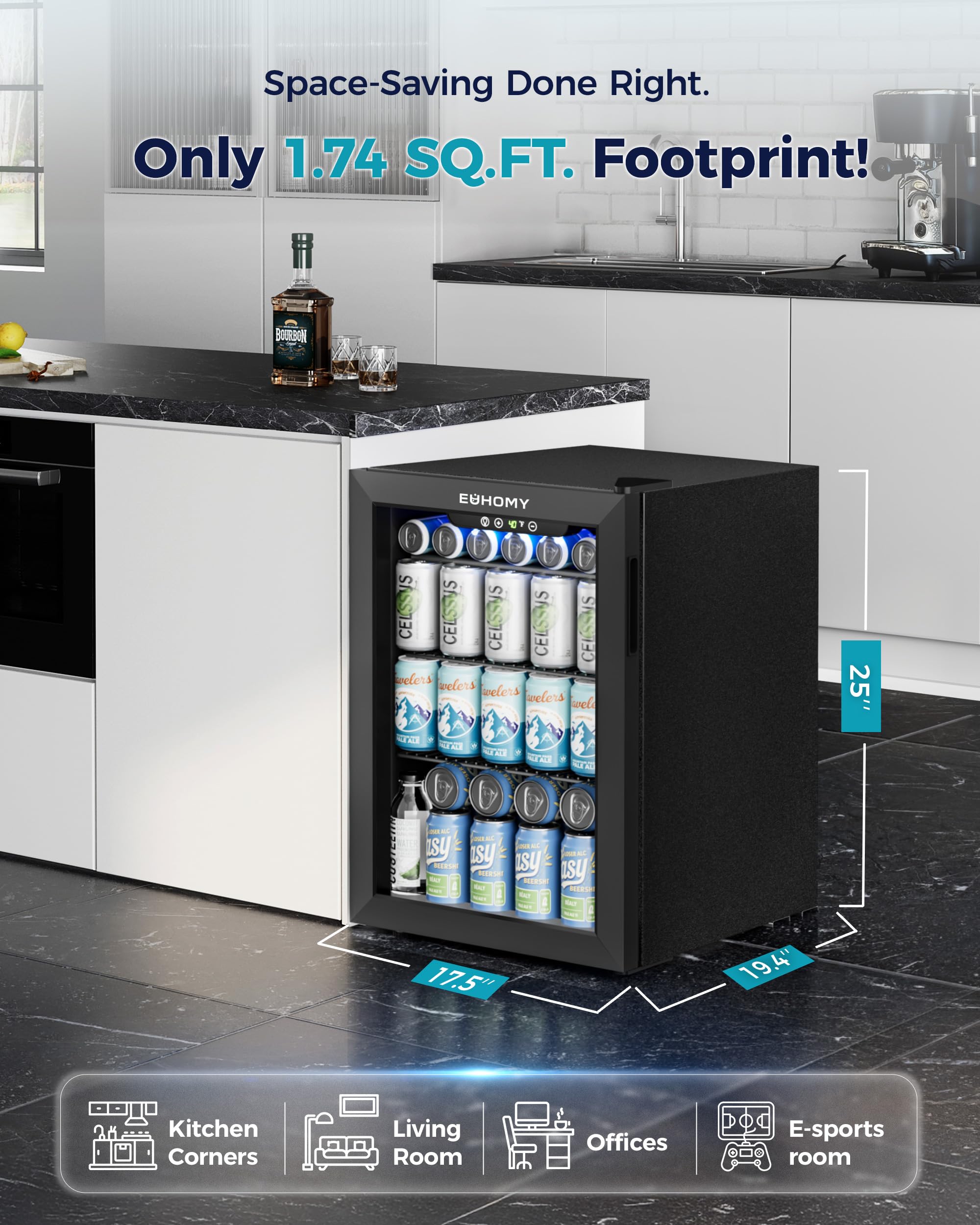 【COMPACT SIZE & LARGE CAPACITY】EUHOMY beverage refrigerator equipped with three removable shelves that offer ample versatility of your beverage storage. The drink fridge can comfortably hold up to 22 standard bottles of wine or 100 cans. Suitable for use in bedroom, office, or RV