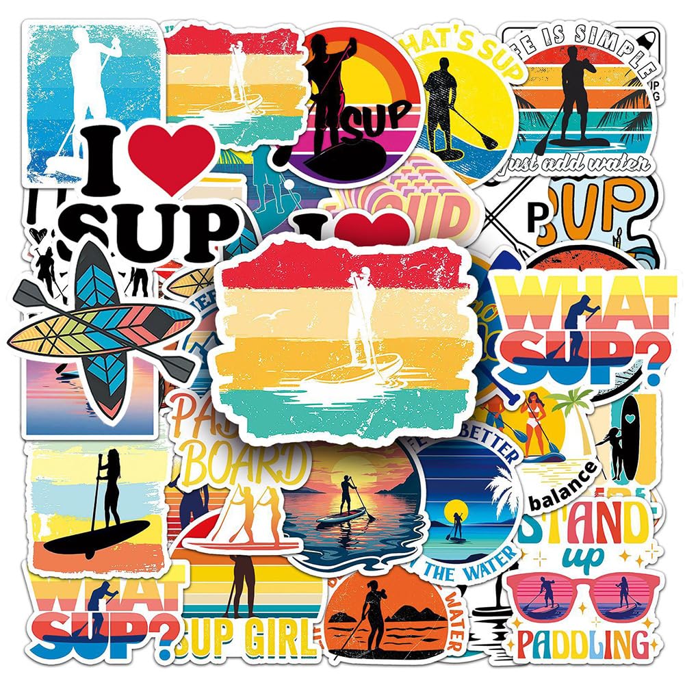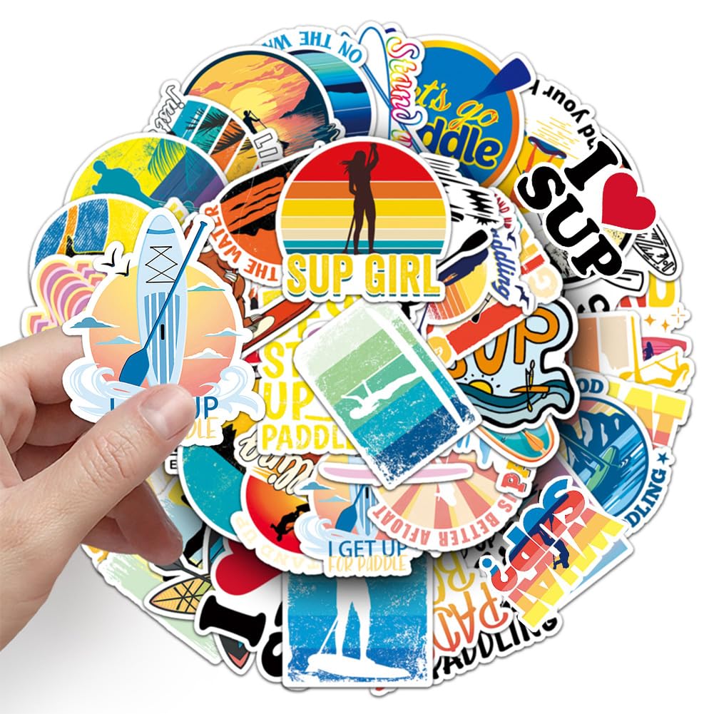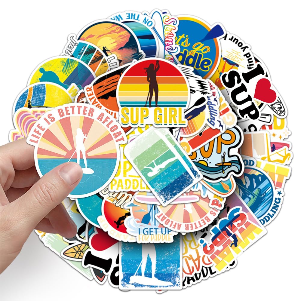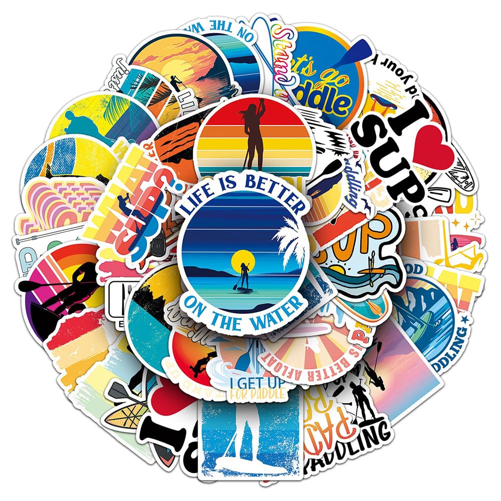 【50Pcs Included】—These Stand Up Paddling theme stickers pack contains 50pcs no duplicated stickers, can be attached to computer, Laptop, skateboard, Luggage, refrigerator, guitar, motorcycle, bike, Mobile Phone, etc. Various patterns sticker pack can be great gift for children, kids, youth, friends, family and other DIY decoration.