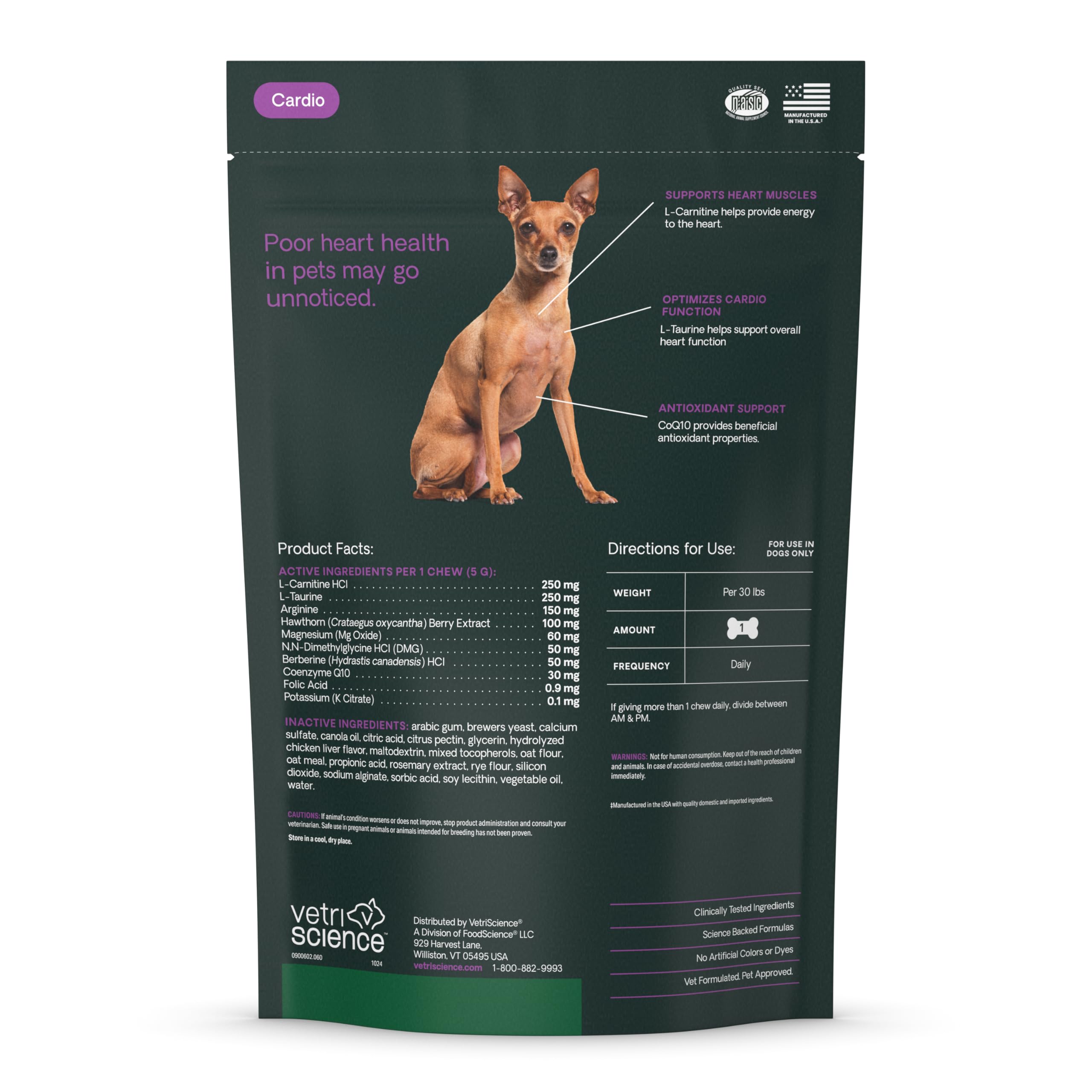 Support your dog’s cardiovascular health with Extra Strength Healthy Heart (new name, same Vetri Cardio Canine formula), a vet-formulated heart supplement for dogs designed to promote strong heart muscles, healthy circulation, balanced heart rhythm, and comfortable breathing. Packed with powerful ingredients like L-Carnitine, Taurine, Arginine, and Coenzyme Q10, this cardiac supplement for dogs helps maintain heart function, support normal cholesterol levels, and boost healthy energy. Hawthorn Berry Extract promotes normal blood pressure levels and optimal heart performance, while essential nutrients like Potassium, Magnesium, and Selenium support heart rhythm and muscle strength. Hydrolyzed chicken liver-flavored chews are ideal even for dogs with dietary sensitivities, making daily supplementation easy and enjoyable. Whether your pet needs extra cardio support due to age, breed, or lifestyle, Extra Strength Healthy Heart delivers science-backed heart health benefits. Backed by veterinary expertise and crafted with premium ingredients, Extra Strength Healthy Heart is particularly recommended for dog breeds known to be at-risk for heart issues, including Cavalier King Charles Spaniels, Dobermans, Boxers, Golden Retrievers, Great Danes, and Poodles. Our dog and cat supplements are certified by the National Animal Supplement Council (NASC), routinely undergo third-party testing, and contain no hidden ingredients, artificial flavors, synthetic colors or preservatives.