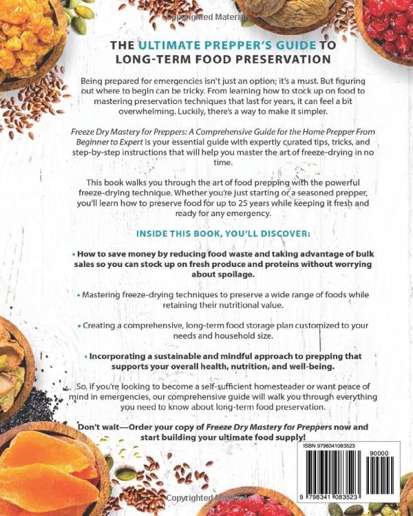 The Ultimate Prepper’s Guide to Long-Term Food Preservation Being prepared for emergencies isn't just an option; it’s a must. But figuring out where to begin can be tricky. From learning how to stock up on food to mastering preservation techniques that last for years, it can feel a bit overwhelming. Luckily, there’s a way to make it simpler. Freeze Dry Mastery for Preppers: A Comprehensive Guide for the Home Prepper From Beginner to Expert is your essential guide with expertly curated tips, tricks, and step-by-step instructions that will help you master the art of freeze-drying in no time. This book walks you through the art of food prepping with the powerful freeze-drying technique. Whether you’re just starting or a seasoned prepper, you’ll learn how to preserve food for up to 25 years while keeping it fresh and ready for any emergency. Inside this book, you’ll discover: How to save money by reducing food waste and taking advantage of bulk sales so you can stock up on fresh produce and proteins without worrying about spoilage. Mastering freeze-drying techniques to preserve a wide range of foods while retaining their nutritional value. Creating a comprehensive, long-term food storage plan customized to your needs and household size. Incorporating a sustainable and mindful approach to prepping that supports your overall health, nutrition, and well-being. So, if you’re looking to become a self-sufficient homesteader or want peace of mind in emergencies, our comprehensive guide will walk you through everything you need to know about long-term food preservation. Don’t wait—Order your copy of Freeze Dry Mastery for Preppers now and start building your ultimate food supply!