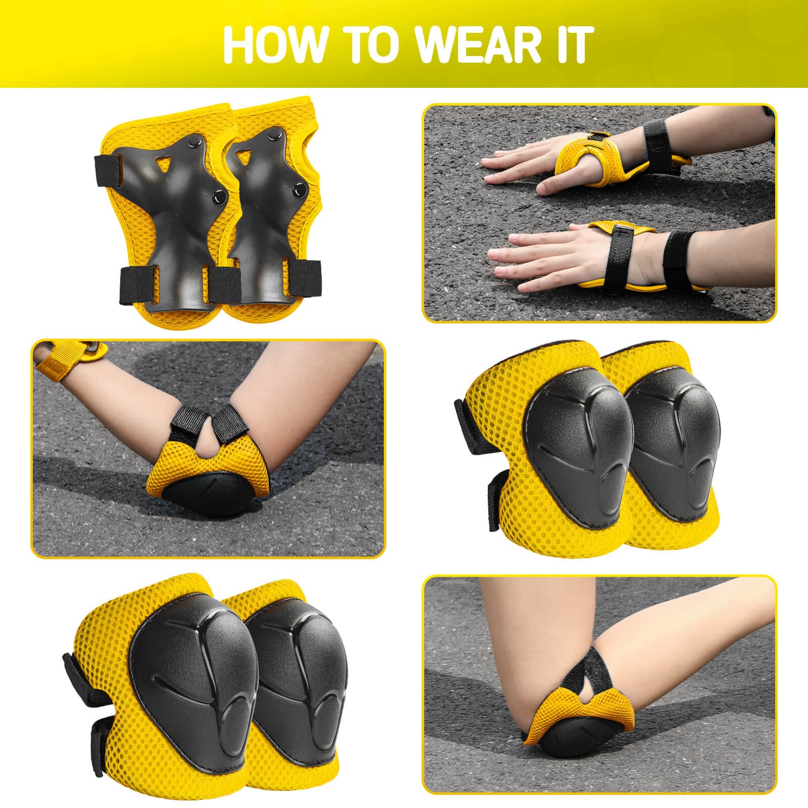 【 Protection Gear Set 】 Includes 2 knee pads, 2 elbow pads, 2 wrist pads and 1 storage handbag, for carrying around outside.