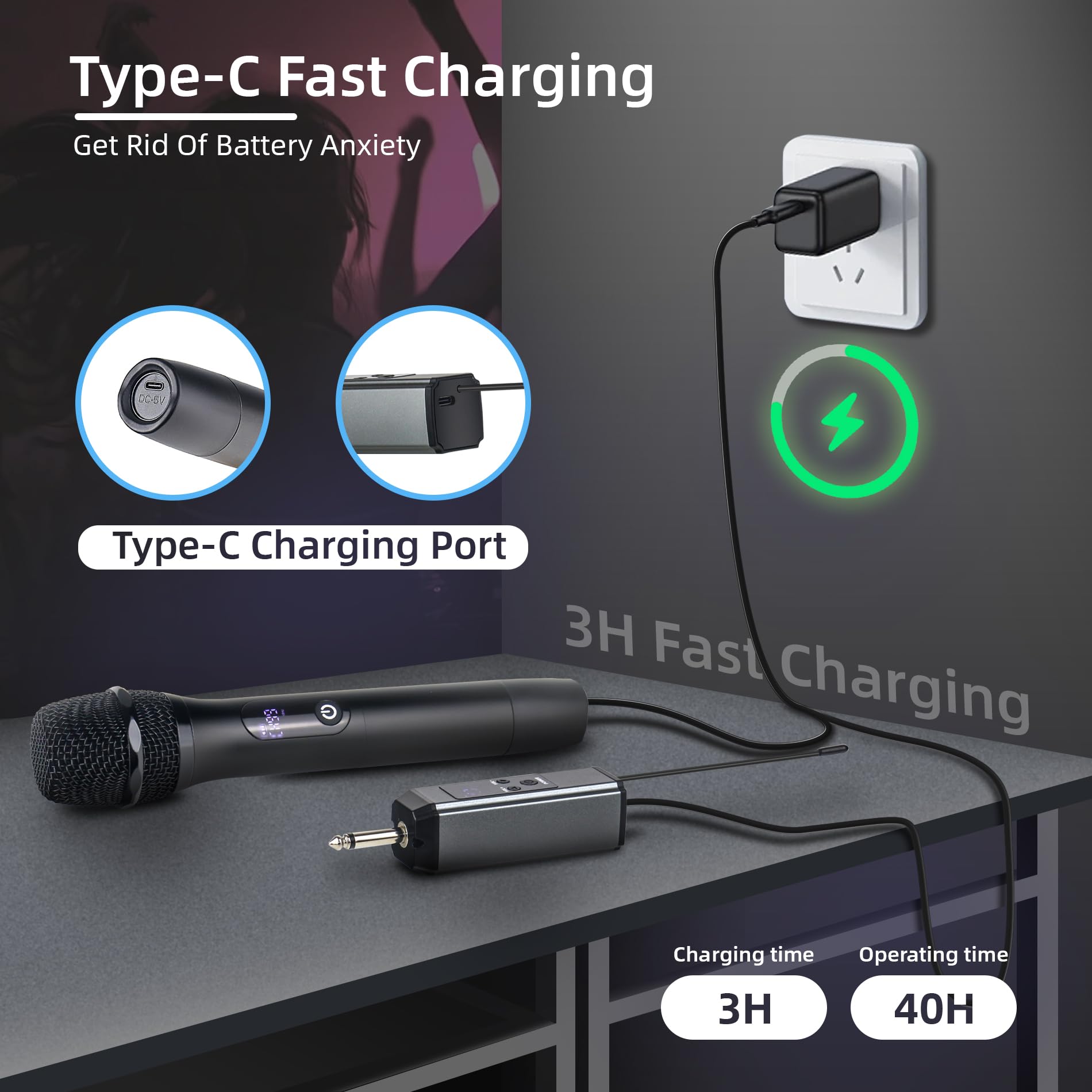 40-Hour Marathon Battery & 3H Fast Charging Say goodbye to frequent battery replacements. The built-in high-capacity rechargeable battery supports up to 40 hours of continuous use on a single charge, outlasting competitors by 3x. With 3-hour fast charging, this karaoke microphone wireless set is always ready for all-day conferences, long karaoke nights, or professional DJ gigs.