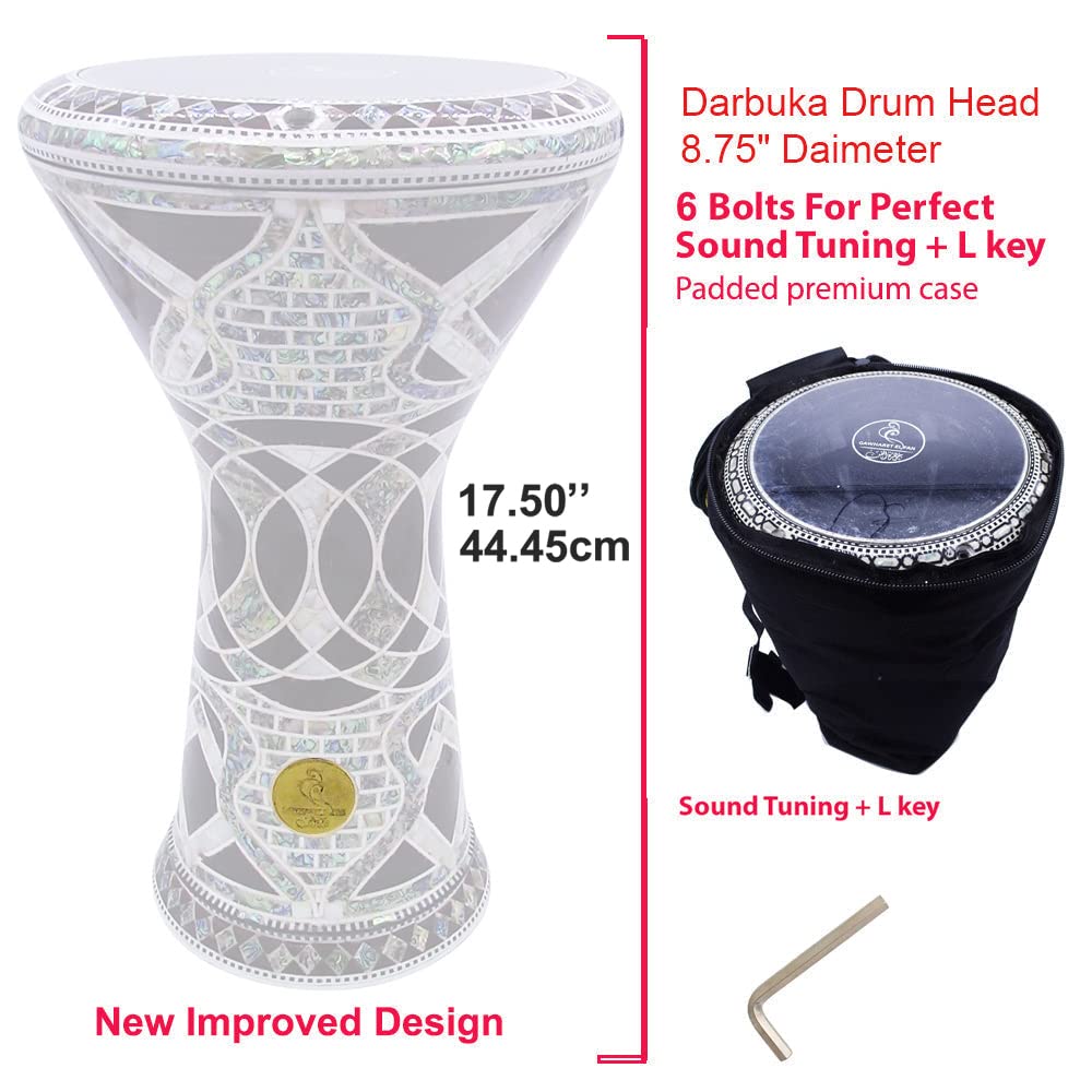 17.5'' length aluminum darbuka with Real Green Mother pearl cover a 8.75" tunable synthetic head. 6 bolts drum head - A tunable and synthetic head can resist elements of changing weather while responding with sharp, ringing highs and low tones that resonate freely This Gawharet El Fan drum comes with these additional accessories: Padded premium carrying case, tuning tool