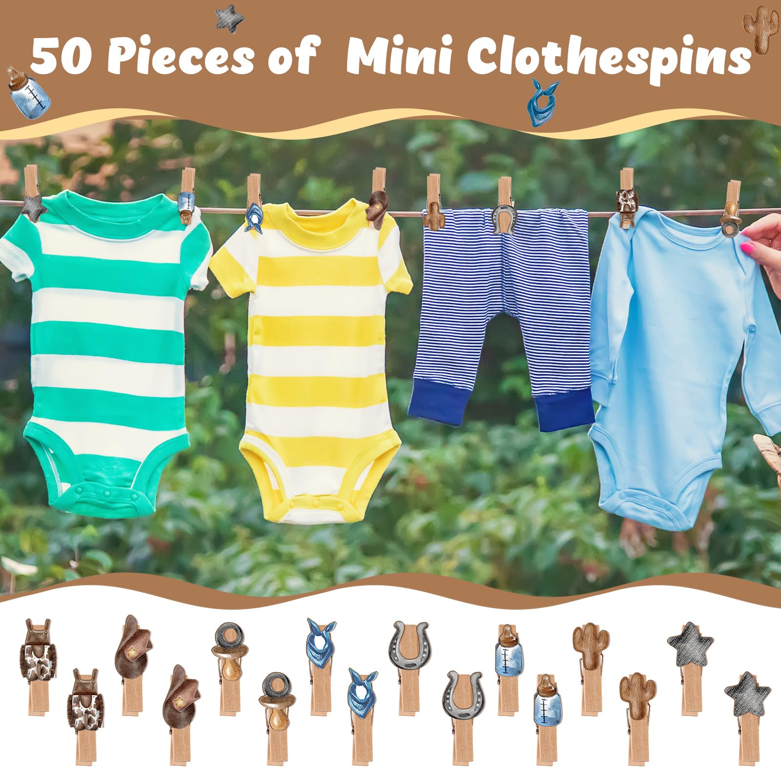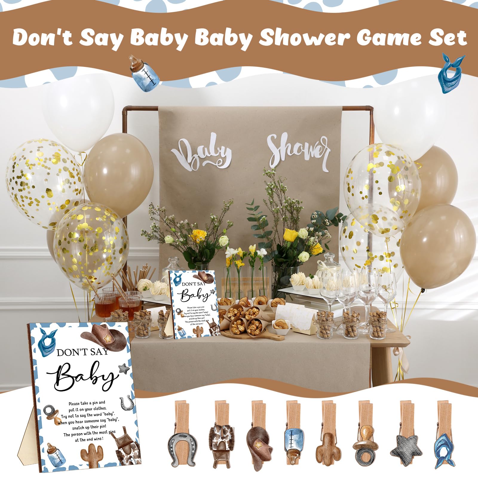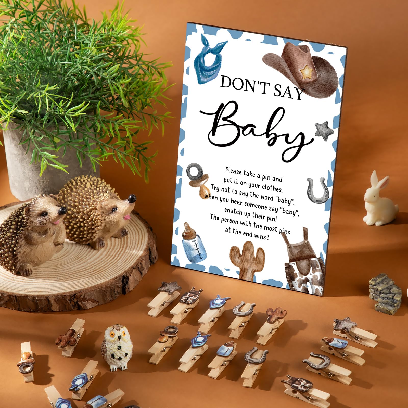 What Will Get: the package contains 1 set of don't say baby game supplies, including 1 piece of cowboy theme wooden don't say baby sign, 50 pieces of cowboy wooden clothespins, enough and complete to meet your party needs