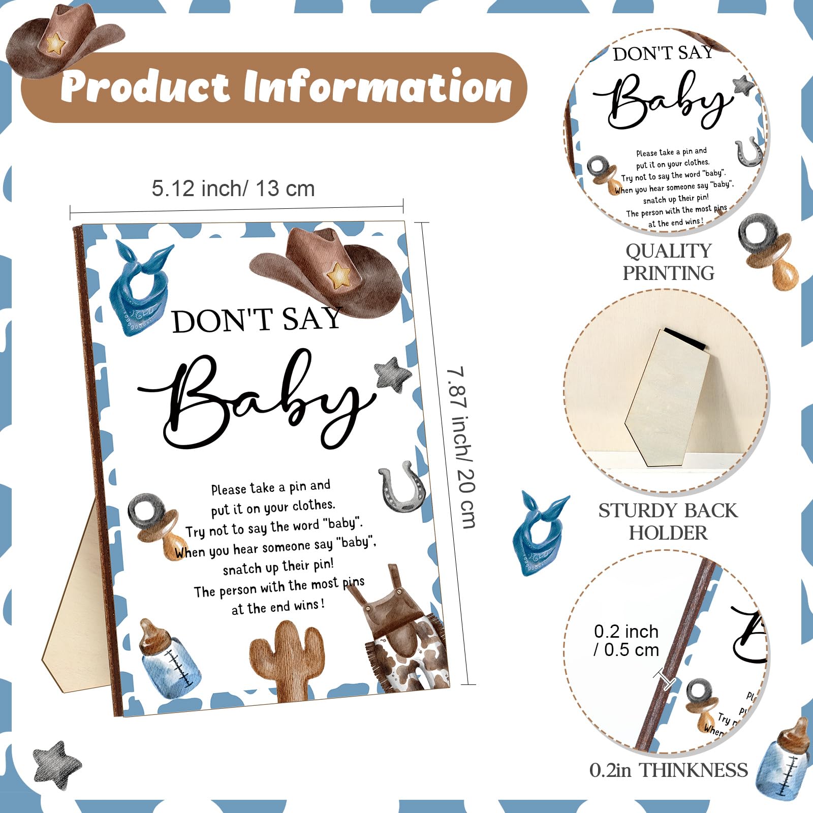 Size Details: the stand sign of this cowboy theme don't say baby game measures approx. 5.12 x 7.87 x 0.2 inch, each mini cowboy clothespin is about 1.18 x 0.28 inches, the proper size for you to decorate your party