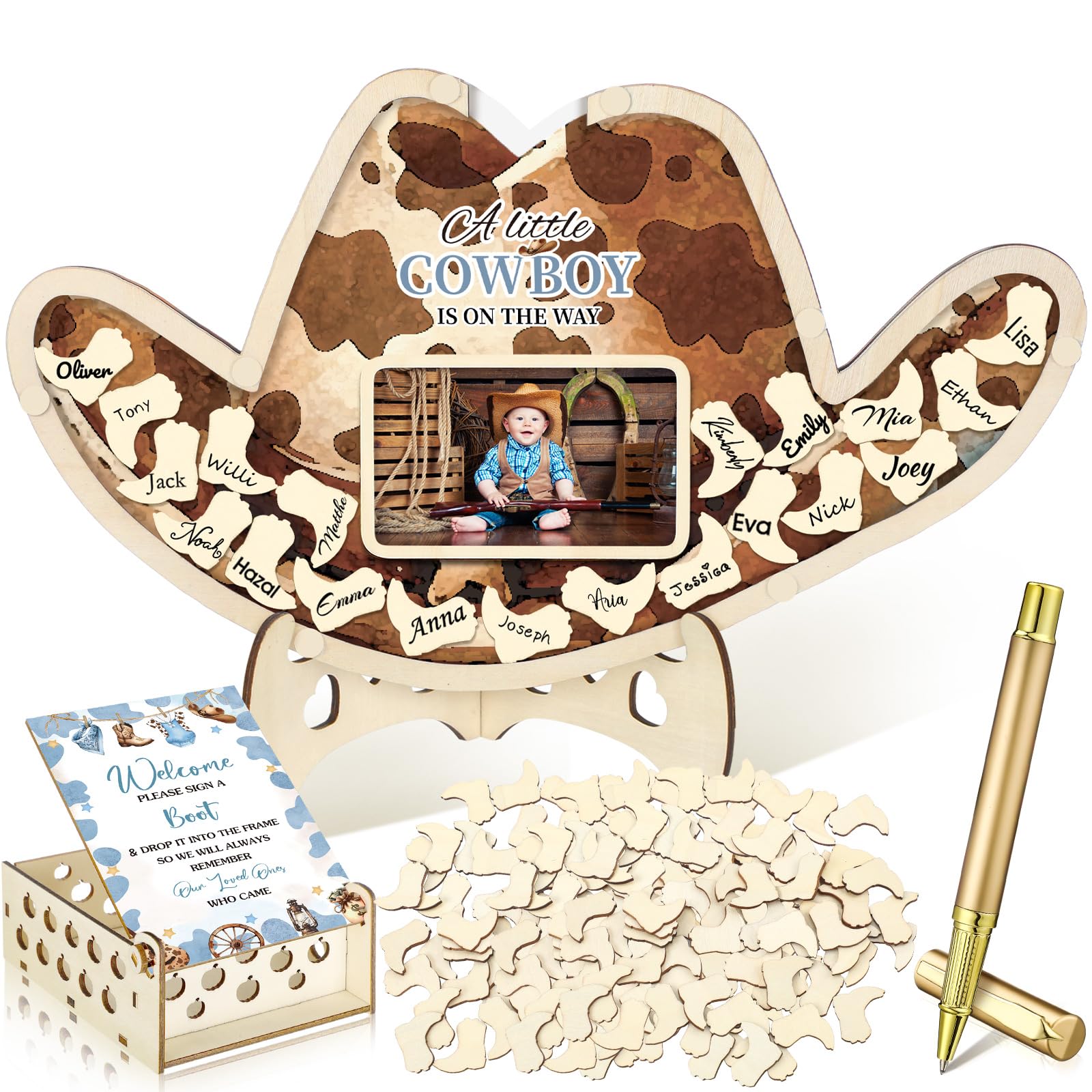 Reliable Quality: the cowboy display card and baby shower pins are made of sturdy wood, strong and not easy to break; In addition, there is a bracket behind the display card, which can be displayed well, an attractive symbol of baby shower