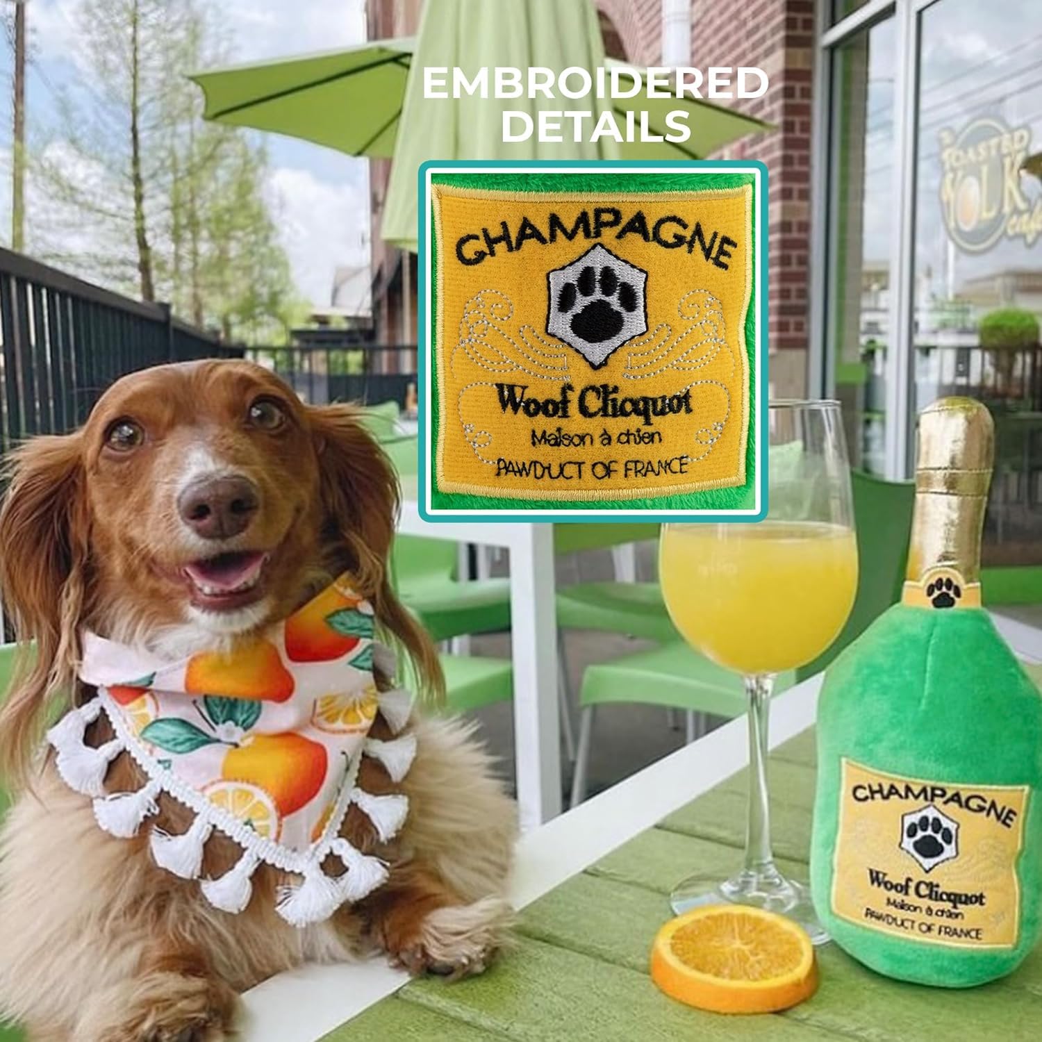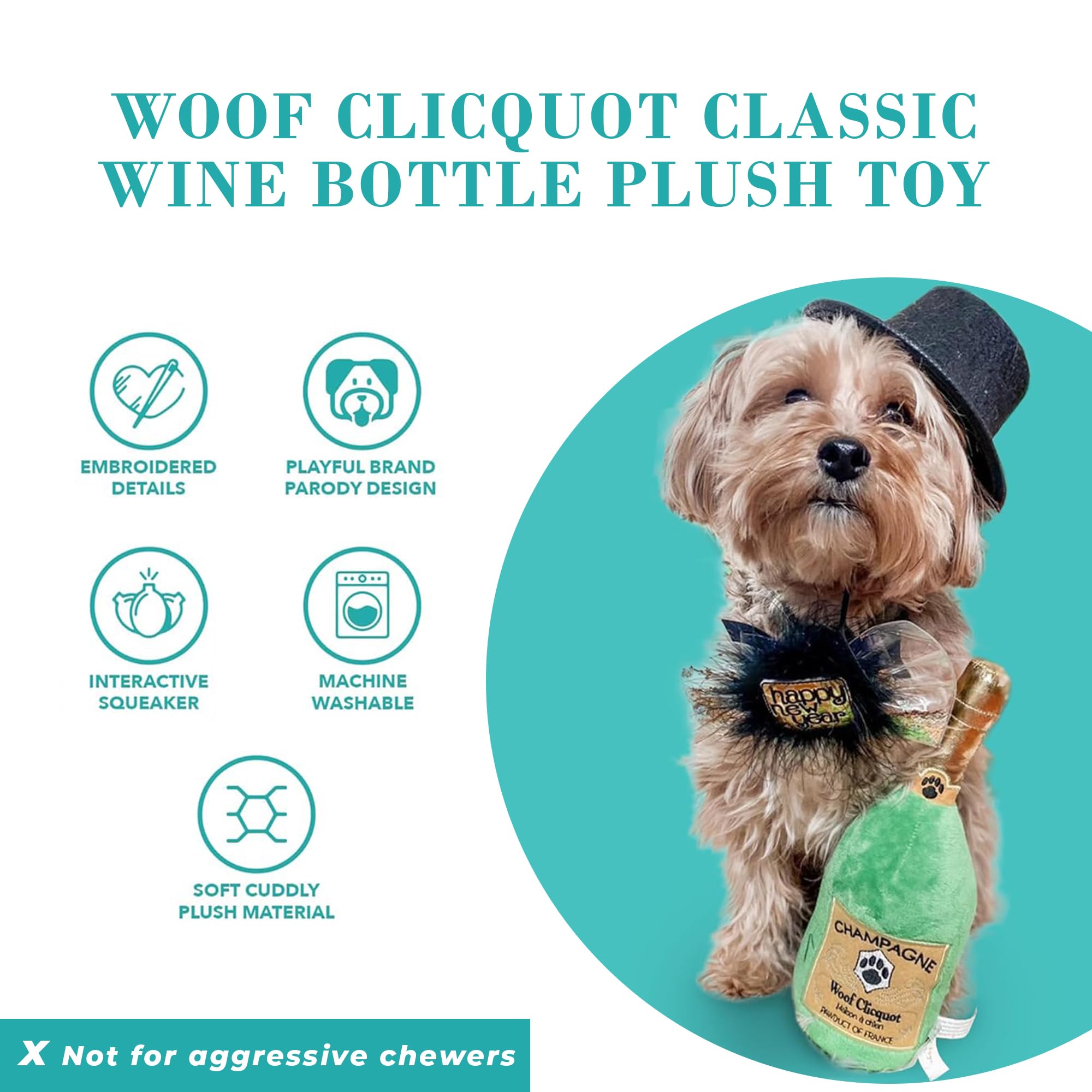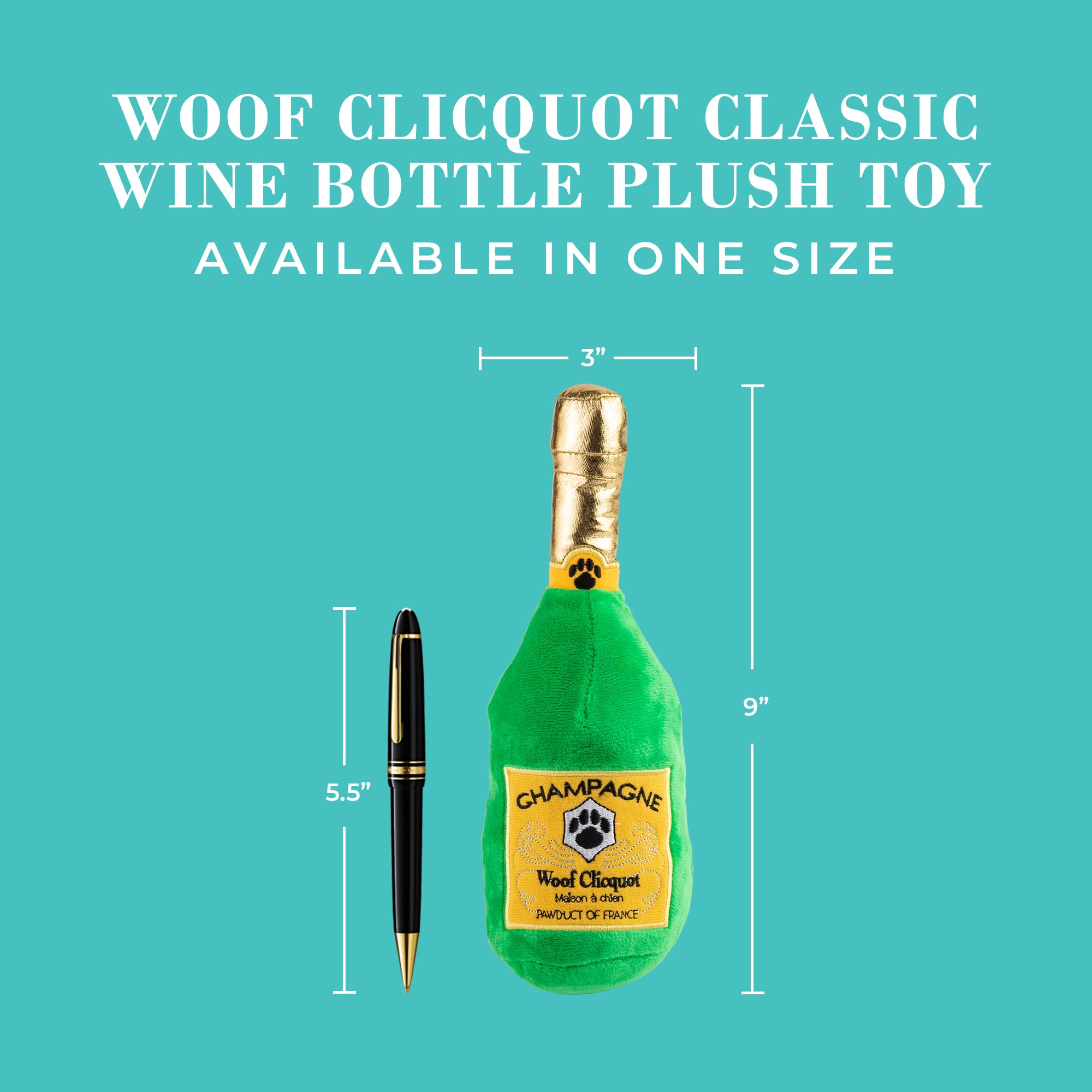 Funny Parody Plush Dog Toy: Time for some fizzy fun with your furry friend by treating them to our Woof Clicquot Classic dog toy, featuring a bright green velvety exterior with a built-in squeaker hidden inside. It’s a playful, cute interactive dog toy that combines style & fun. One Size 9.5"x3"x2".