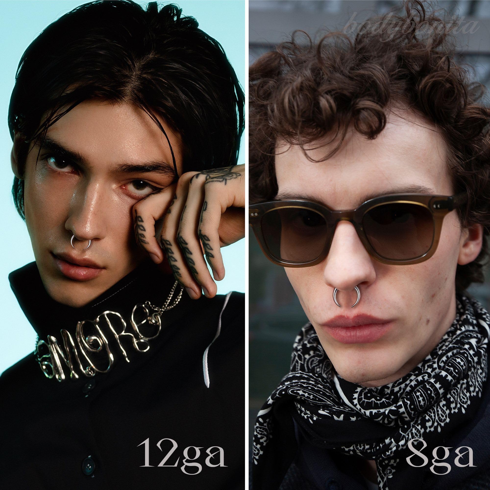 12 Gauge Septum Rings: One order includes 1 pc of big gauge septum ring: Gauge size: 12G (2.0 mm); Inner Diameter: 10 mm;Color: Silver; Material: G23 Titanium; Please refer to our size chart to select the appropriate size; Don't worry if the size doesn't fit