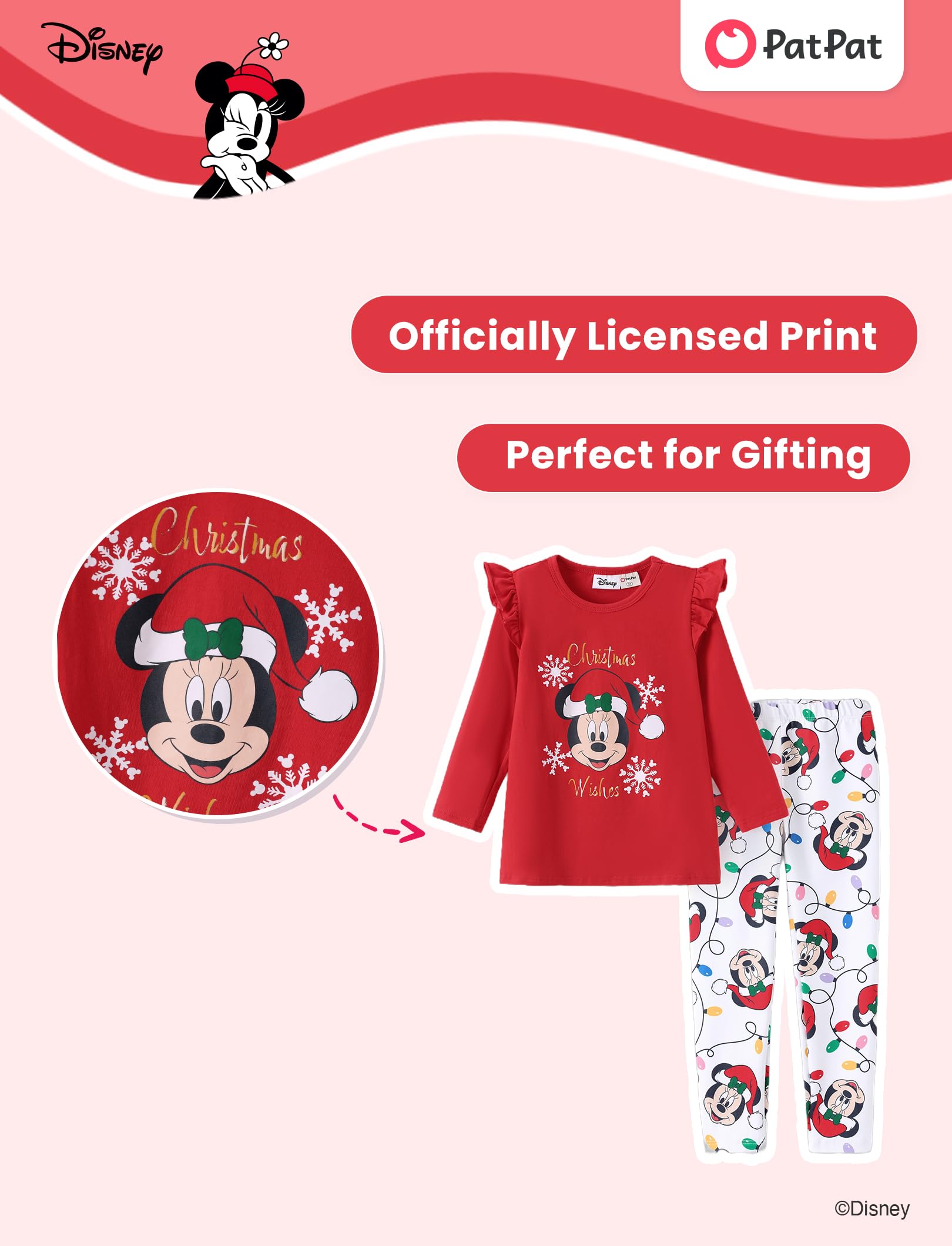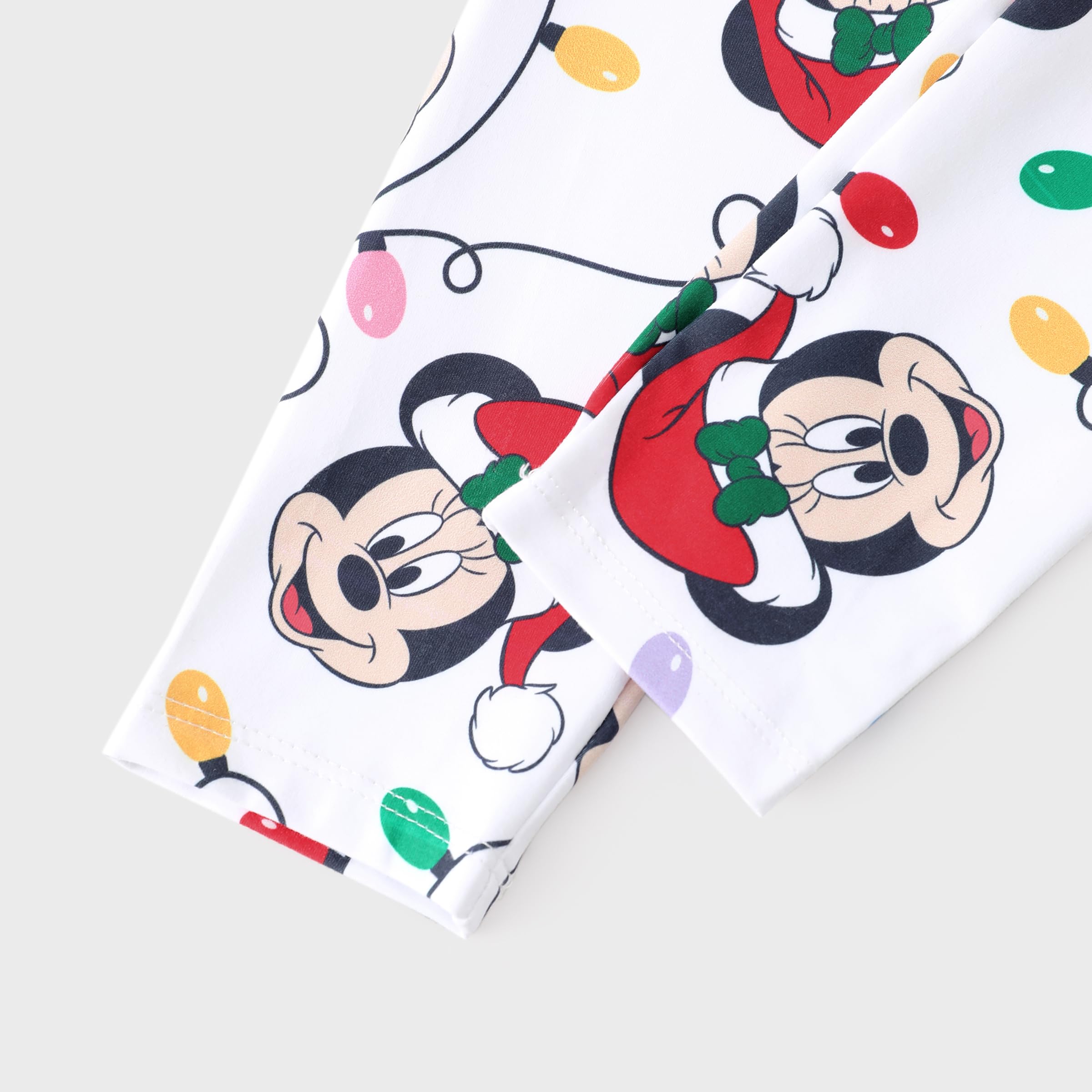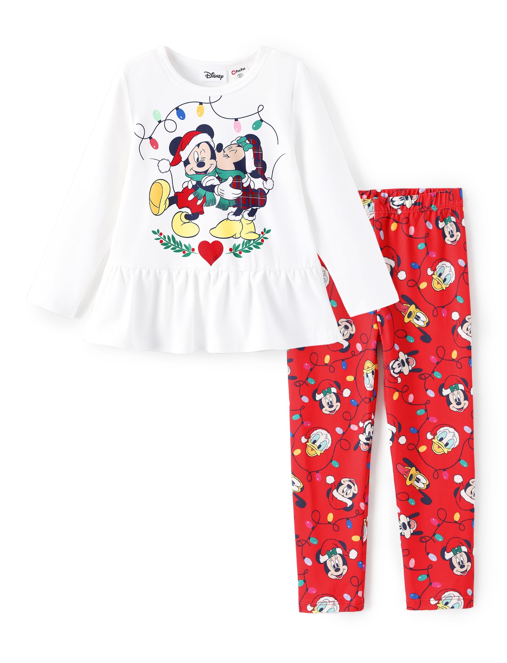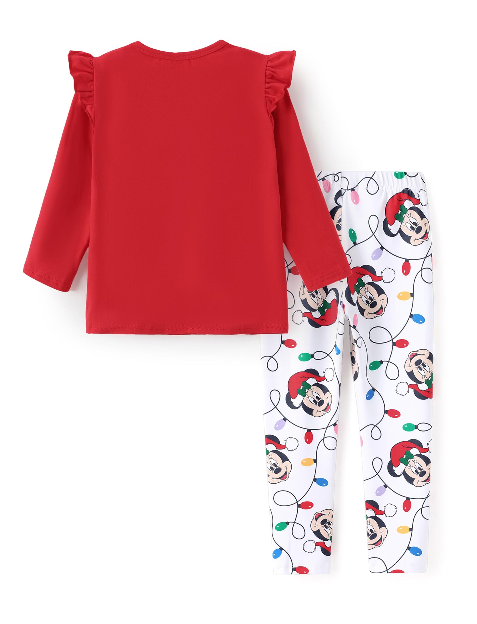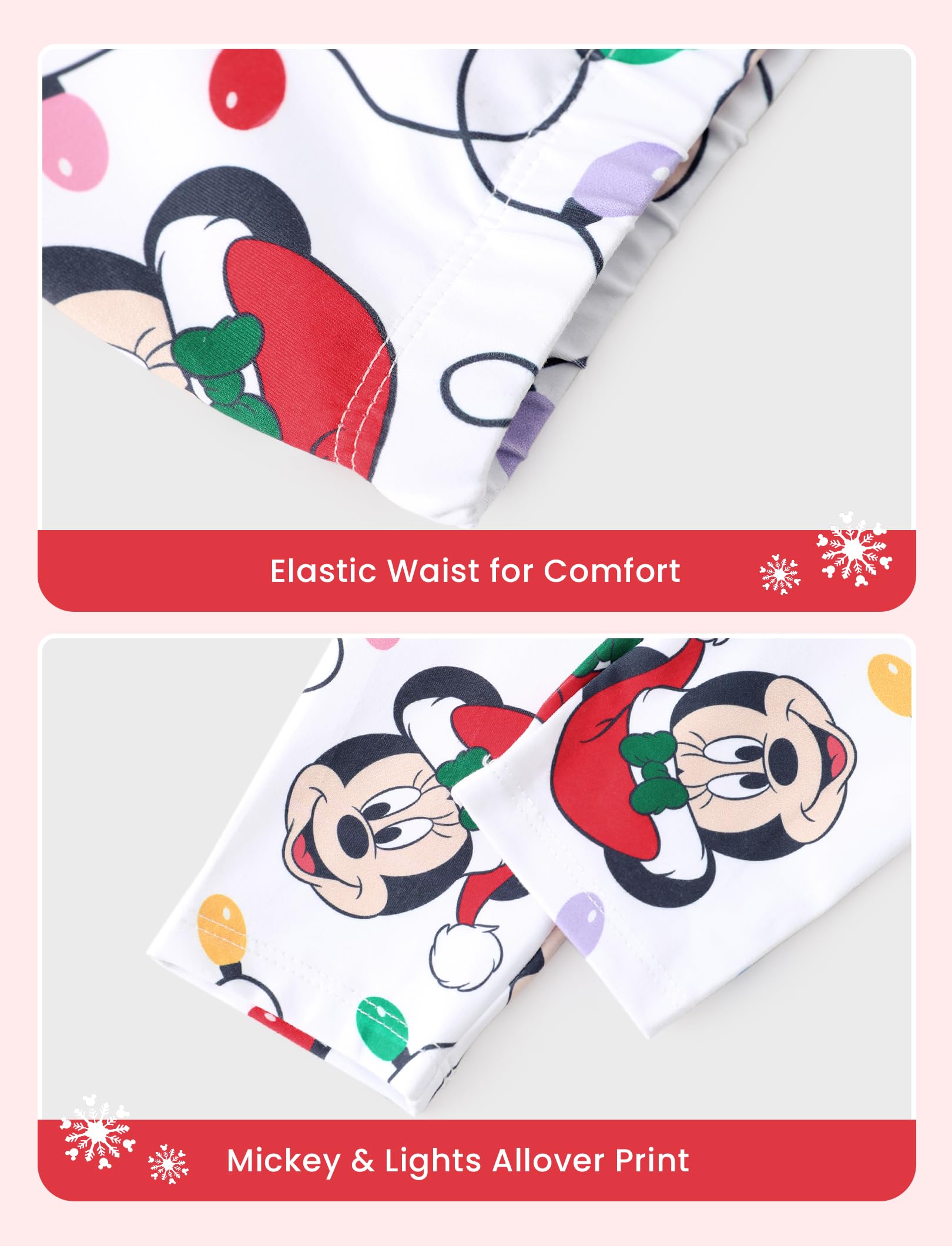 Adorable & Playful Design: The set includes a bright red top with a Christmas Minnie Mouse graphic and matching white leggings decorated with Minnie in Santa hats and colorful Christmas lights. The vibrant colors and holiday details make this outfit a fun choice for festive celebrations and everyday wear throughout the season