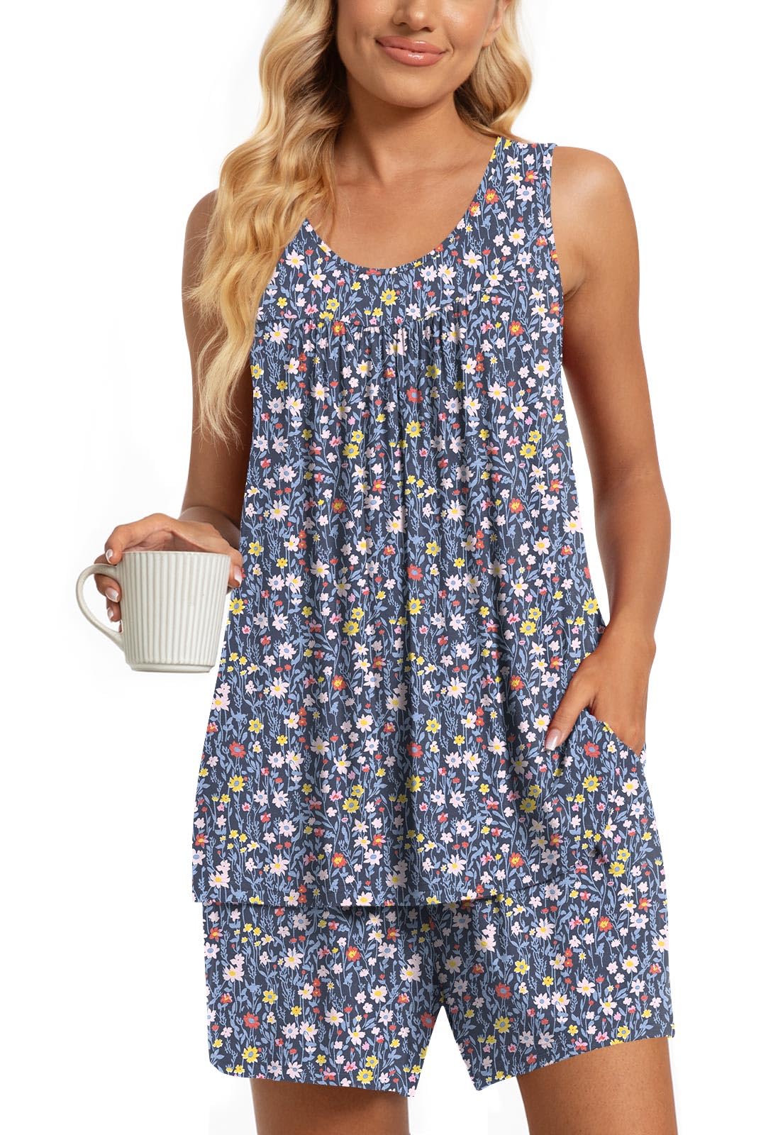 Fashion-Simple Design: Cute two piece outfits, sleeveless tops, soft nightwear, scoop neck and front pleated detailed design. Elastic waistband shorts, casual loose comfy, graceful and easeful