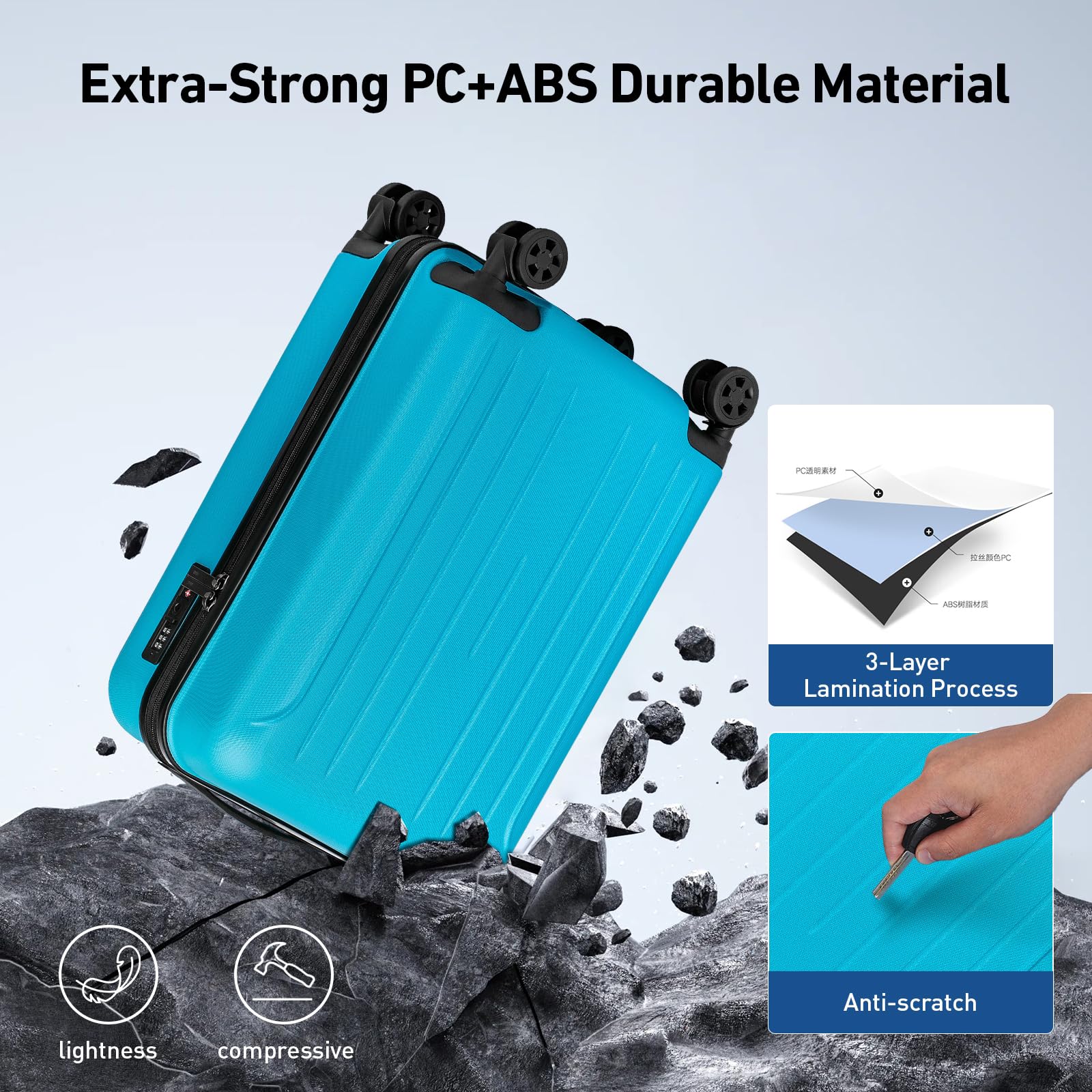 Lightweight Yet Unbreakable: Crafted from premium PC+ABS material, this suitcase is featherlight yet tough enough to withstand extreme temperatures (40-50℃) – because your adventures shouldn’t have limits!