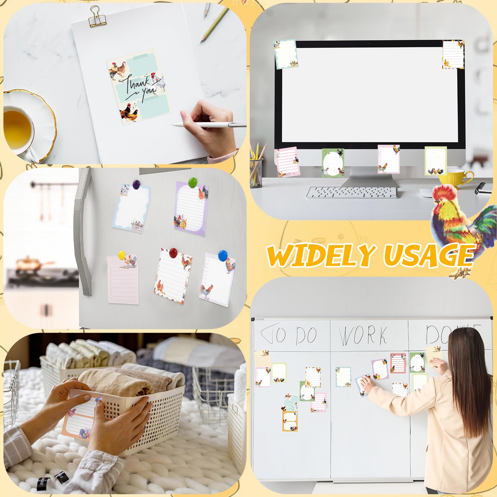 Adhesiveness and Detachability: with nice adhesion, these chicken sticky notes can be easily pasted on smooth and dry surfaces, such as textbooks, notebooks, refrigerators, blackboards, walls, windows, doors, bulletin boards, etc., and can be easily removed without leaving stains