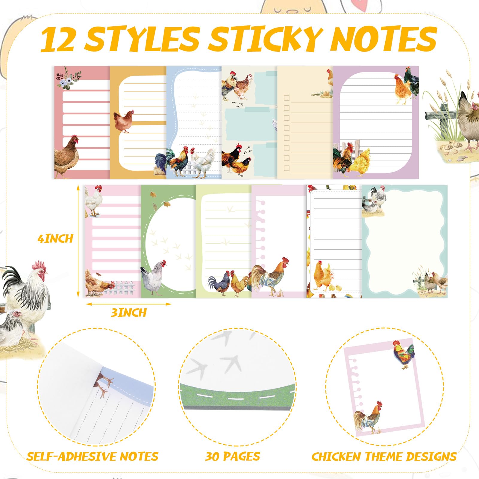 Sufficient Quantity: you will receive 12 pcs of chicken themed sticky notes, packaged with 30 pages each, for a total of 360 sheets; The dimensions are a handy 3x4 inches /7.6x10 cm, enough quantity and rich design to meet your various needs and replacements