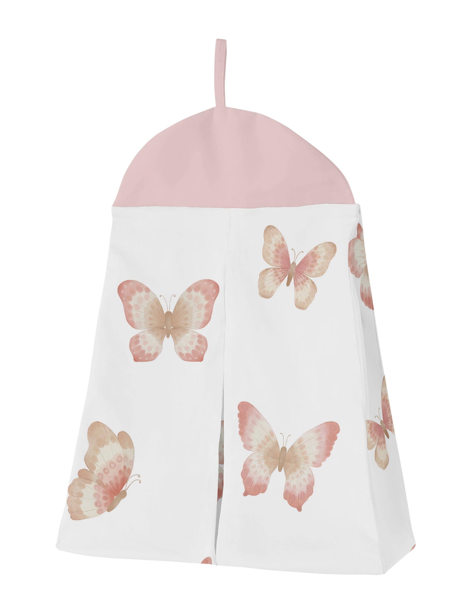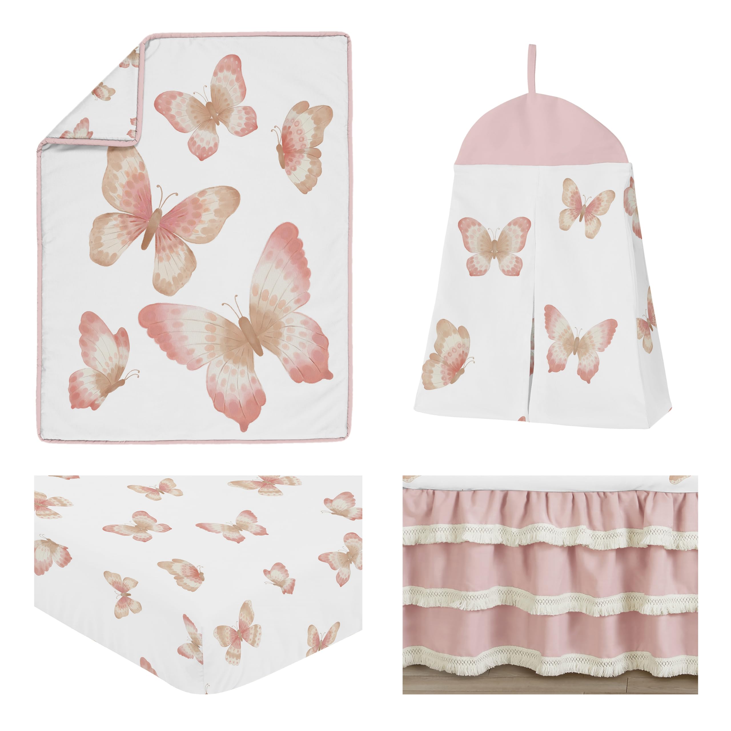 The perfect baby shower gift! All your baby room essentials can be found in one set for your nursery. Newborn blanket features fluttering hand painted butterflies and reverses to a pattern of butterflies. Ultra soft crib mattress sheet is made with brushed microfiber. Crib bed skirt dust ruffle is a solid blush pink. This set is made complete with the coordinating diaper stacker, featuring ties to conveniently hang anyplace in the bedroom to store diapers.
