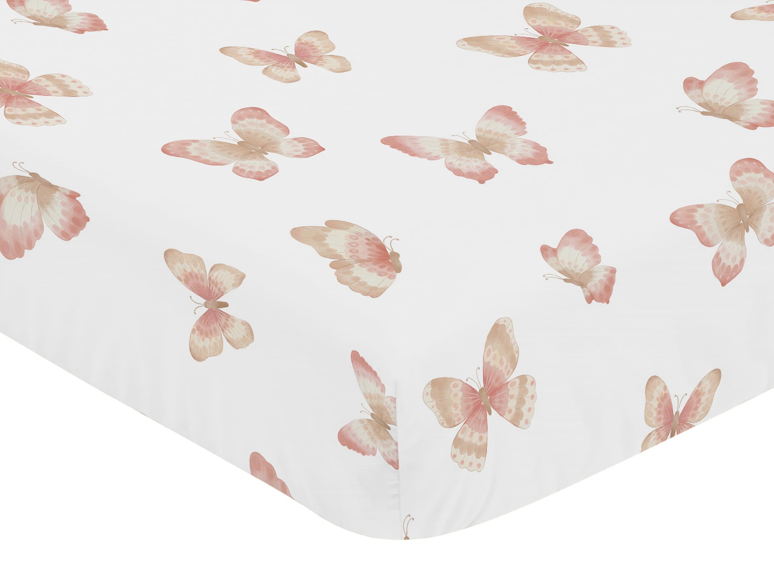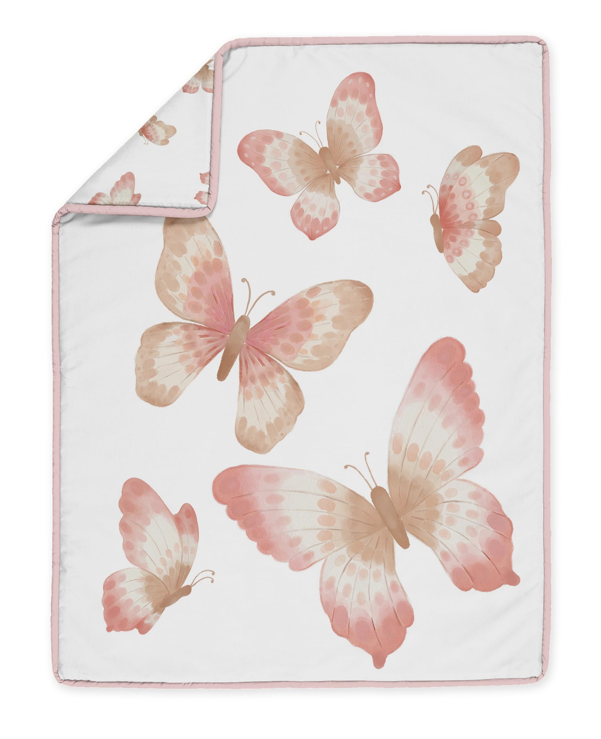 This baby bedding set boasts a color palette of rose, mauve, taupe, ivory, tan, and dusty pink fluttering hand painted boho butterflies in a shabby chic watercolor bohemian butterfly pattern