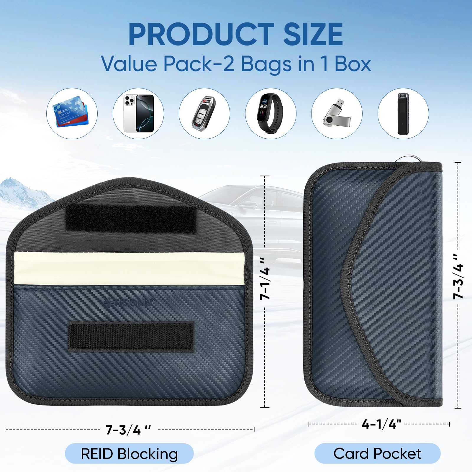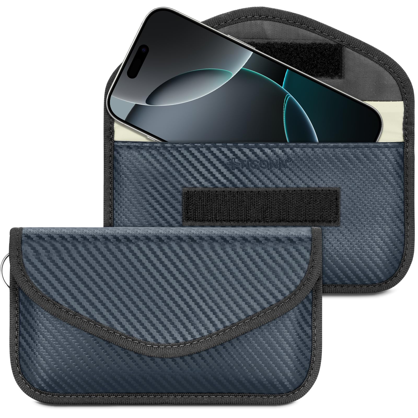 Premium Quality: TICONN faraday bag is constructed with premium carbon fiber textured material and two-layers of shielding materials packed in a gift box; It provides signal blocking functions as well as a luxurious fashionable appurtenance