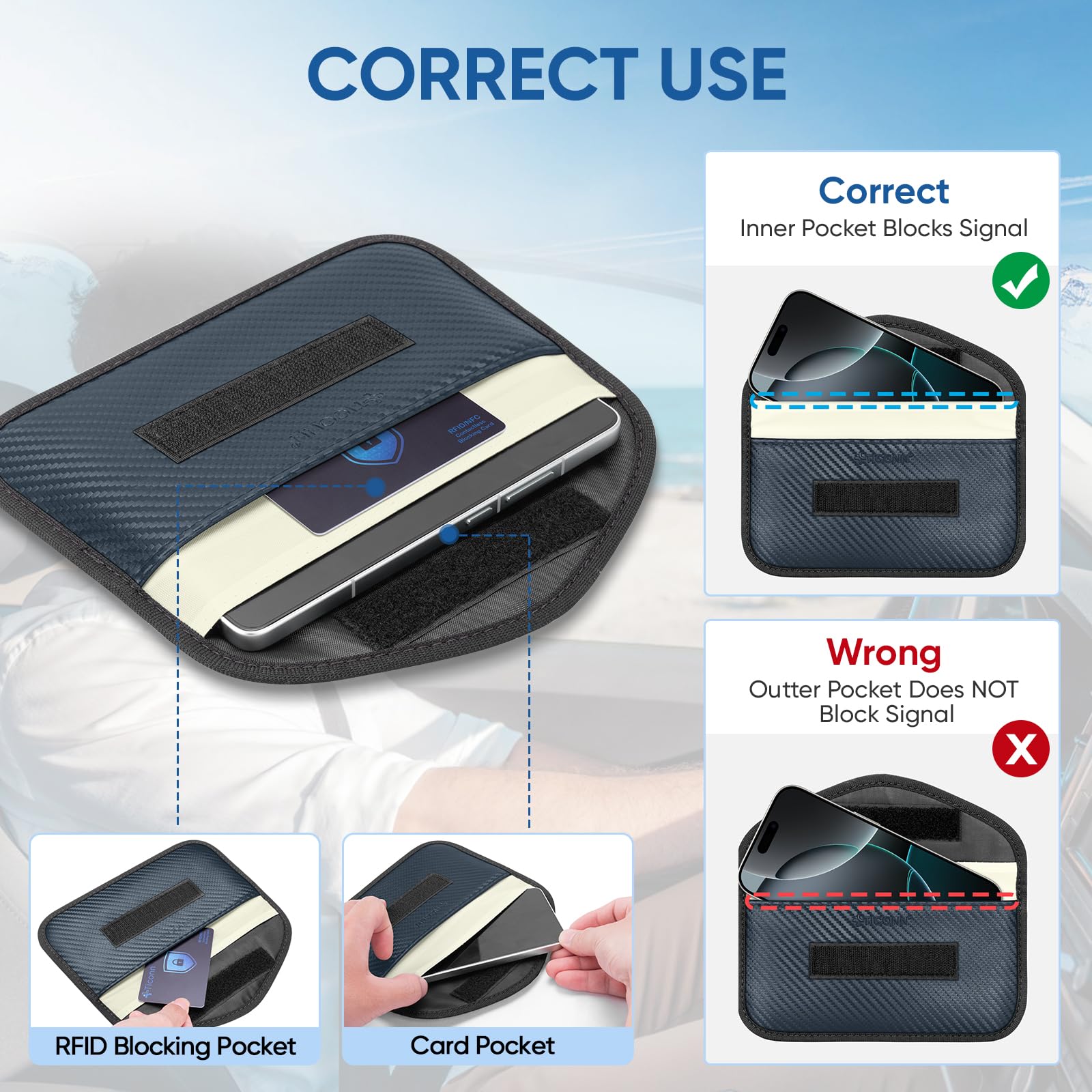 Convenience: The smaller/front pocket is anti-radiation, best for storing ID card, bank cards, etc; The larger/back pocket is for signal blocking, best for storing car key fobs