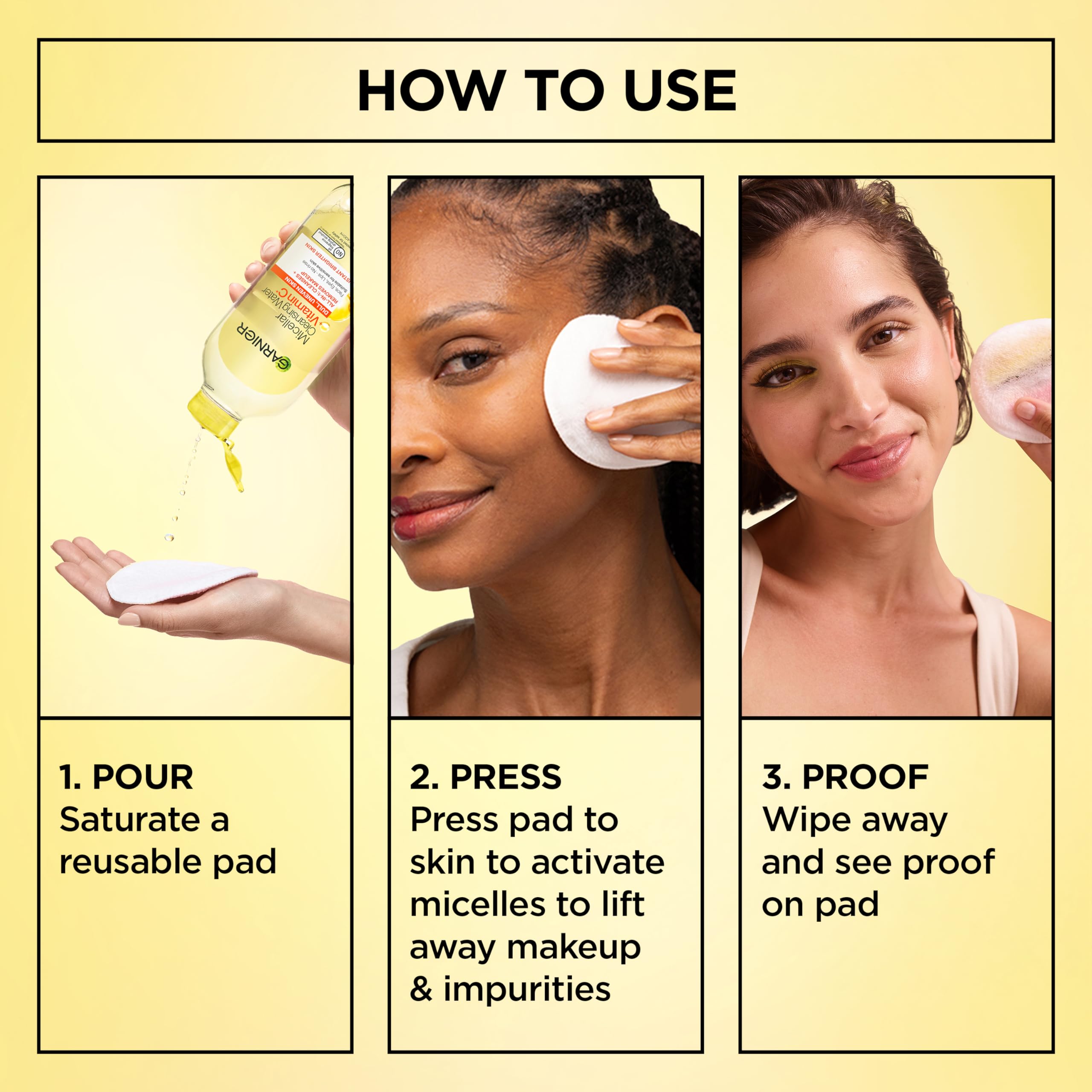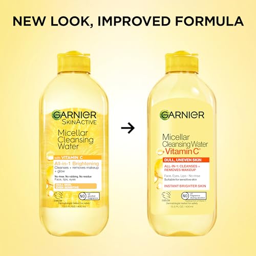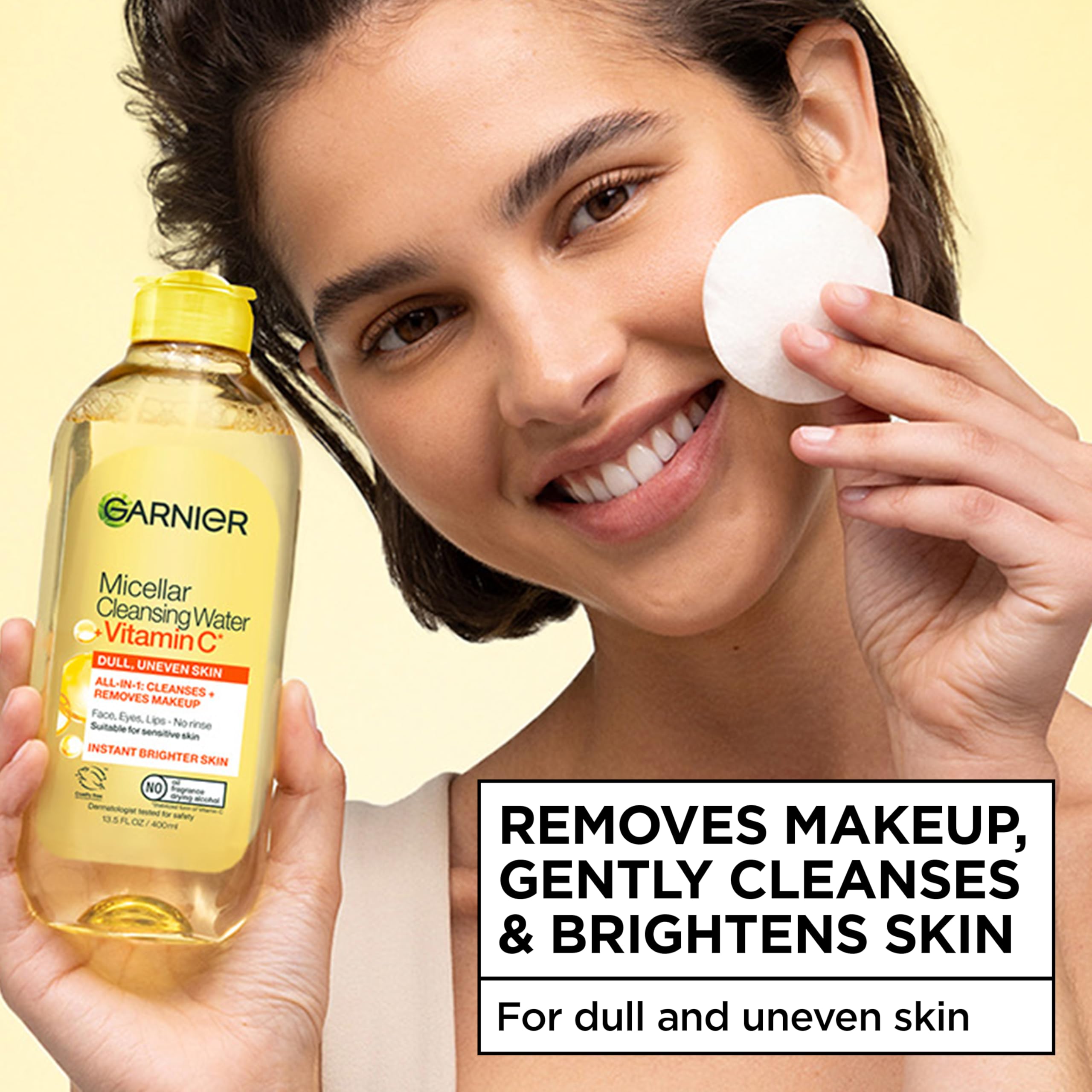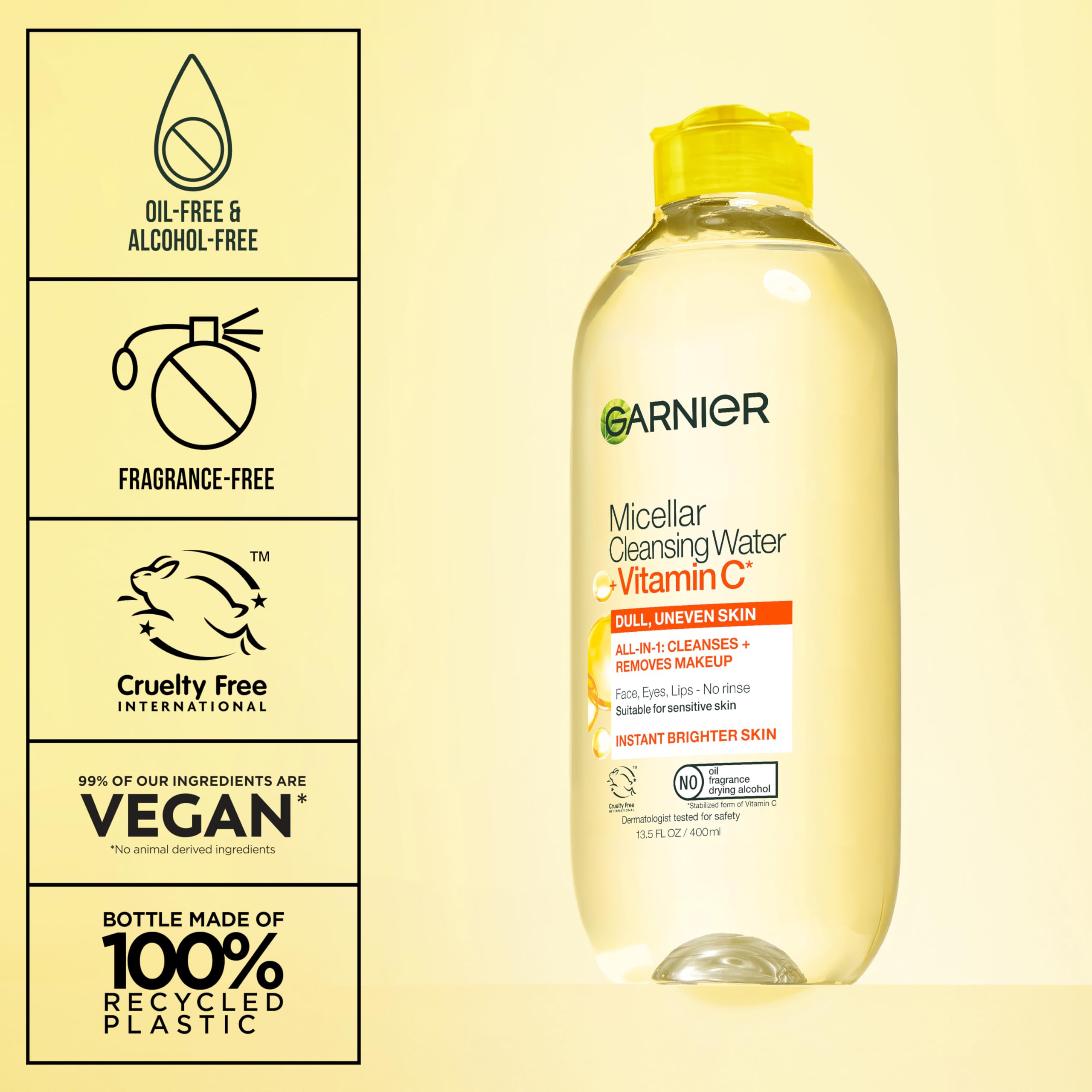 This All-in-1 Brightening Micellar Cleansing Water is a facial cleanser and makeup remover that is surprisingly powerful, yet gentle on skin. The Garnier Micellar Cleansing Water with Vitamin C works for all skin types. It effectively cleanses, removes makeup and boosts glow. Like a magnet, micelles capture and lift away dirt, oil and makeup without harsh rubbing. This facial cleanser removes makeup, leaving skin perfectly clean without over drying. This Garnier Micellar Cleansing Water with Vitamin C is gentle on skin and can be used to remove face makeup and eye makeup. The gentle cleanser is vegan and formulated without alcohol, oils and Fragrance. America's #1 Micellar Water based on Nielsen sales data, units Sold, year to date week-ending 8/1/2020.