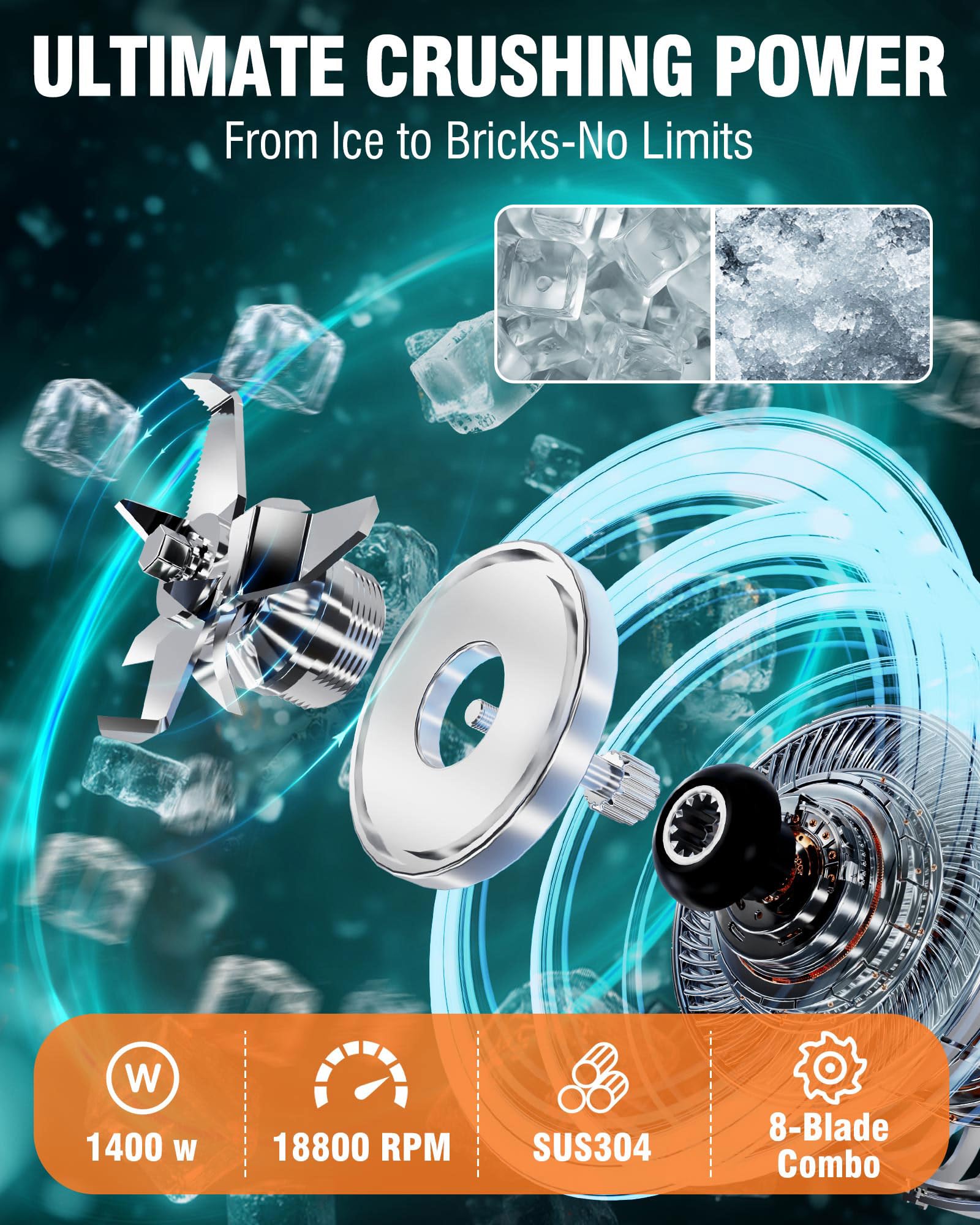 ICE CRUSHING POWER: Featuring a 1400W motor and 8 durable stainless steel blades, this heavy-duty blender delivers 18800 RPM, crushing ice and tough ingredients in seconds for consistent results in high-demand environments