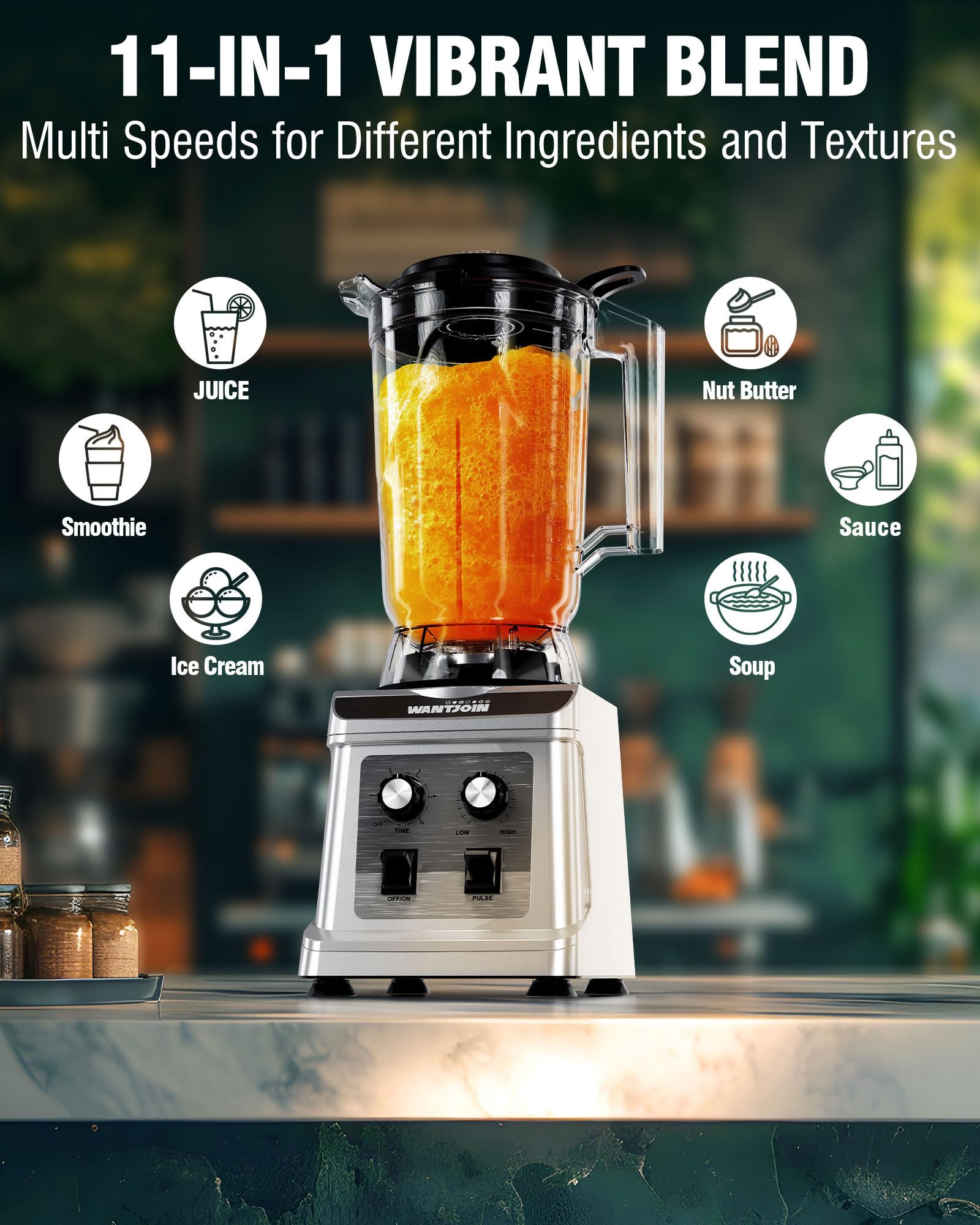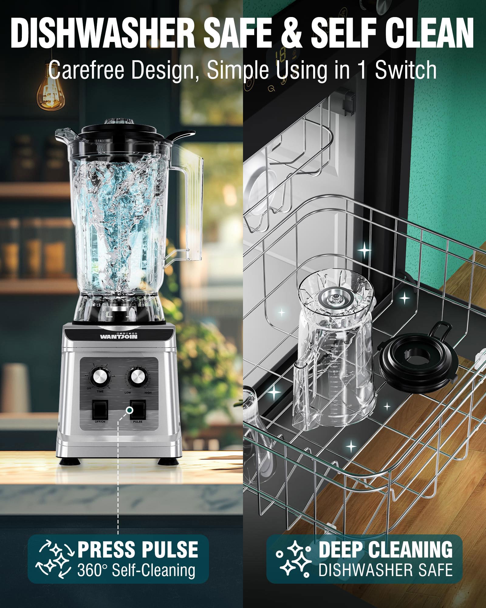 VERSATILE & EASY TO CLEAN: Perfect for smoothies, juices, soups, and more, with a 1-5 minute timer, adjustable speed settings, and a pulse function. Dishwasher-safe and equipped with one-touch cleaning for easy maintenance