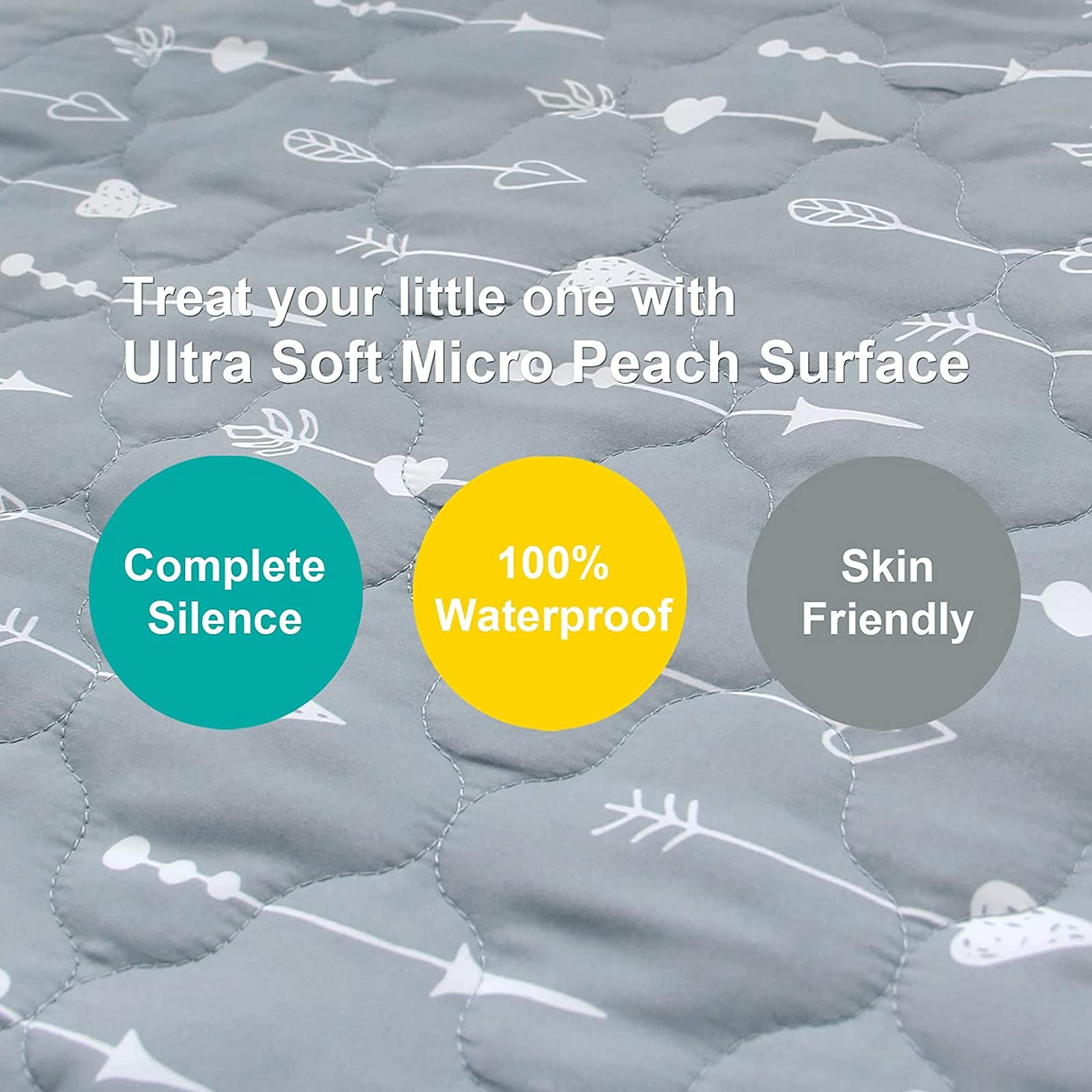 Premium Protection: Our quilted mattress protector with extra thick padding for your little feel comfortable. Our waterproof layer is made of food-grade TPU that won’t make a crinkly plastic noise when your little one moves, and against everyday liquids and stains.