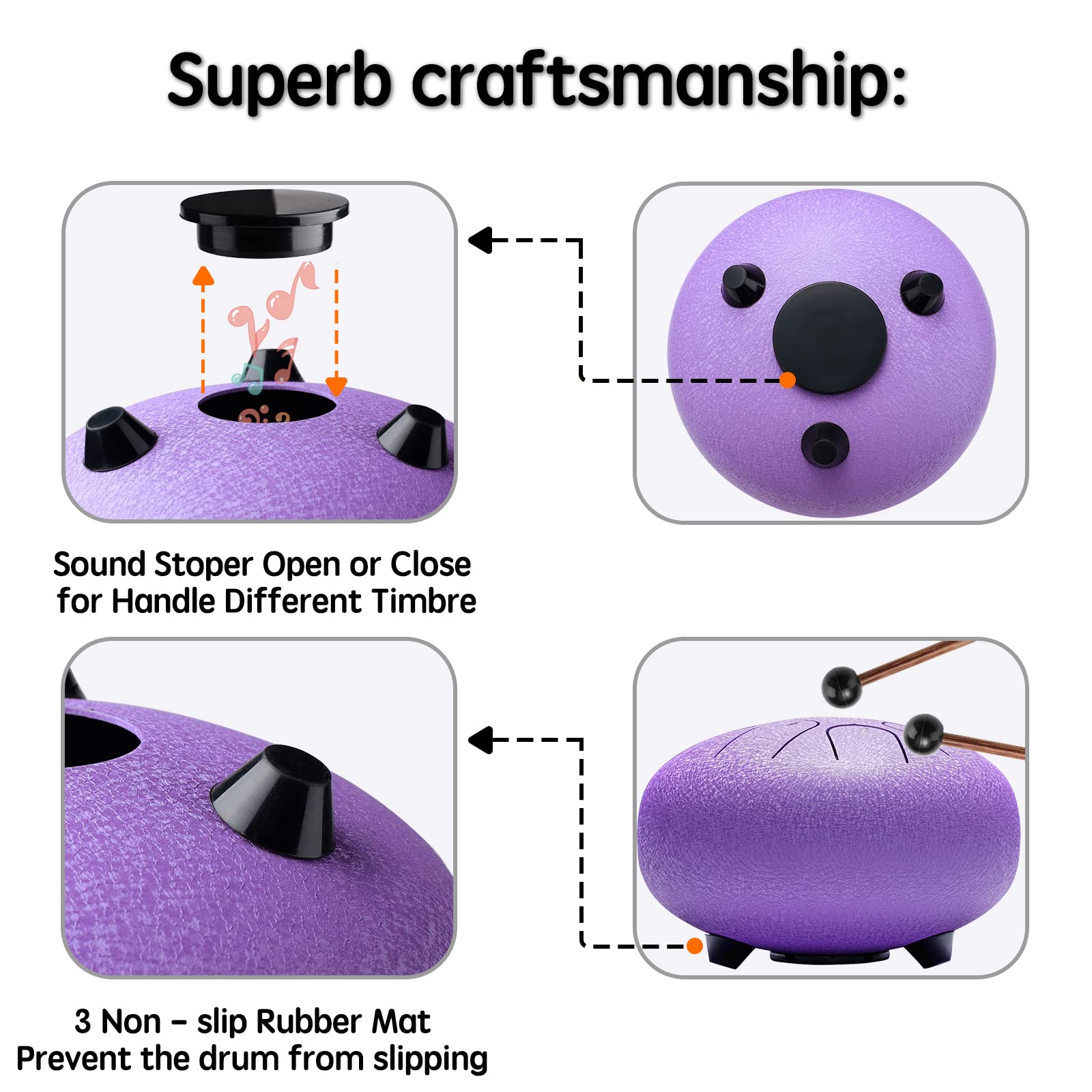 π Accessories Upgrade: 6 inch steel drum, drum mallets, drum bag, finger plectrums, spare note stickers, sheet music, mallets stand. Steel drum are a total of 8 tones, which have a wider range of sound and can play more music. You can play steel drum with the included drum mallets or with you hands, and the included note enable beginners to learn and play it more easily. Steel drum comes with a carry-on bag for easy carryinag