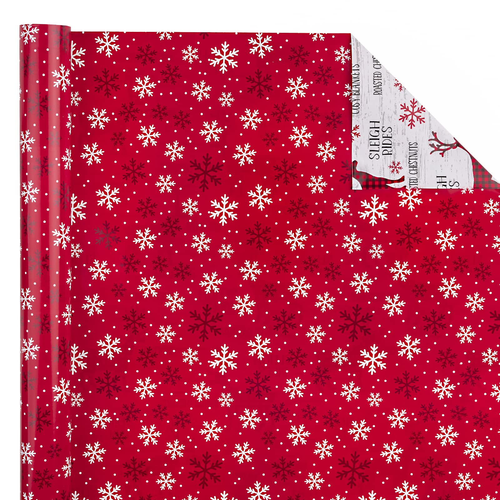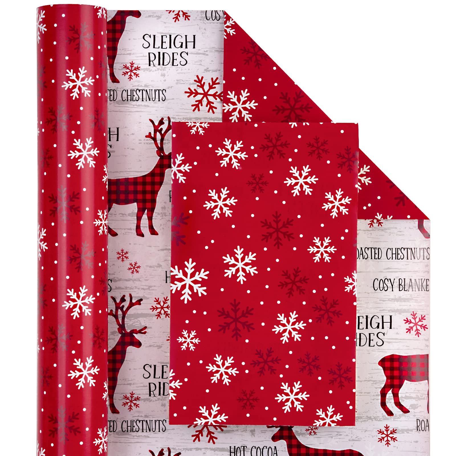 Reversible Design: Red and white snowflakes printed on one side, red and black buffalo plaid reindeer printed on the reverse. Two different designs make unique and varied gift presentations easy.