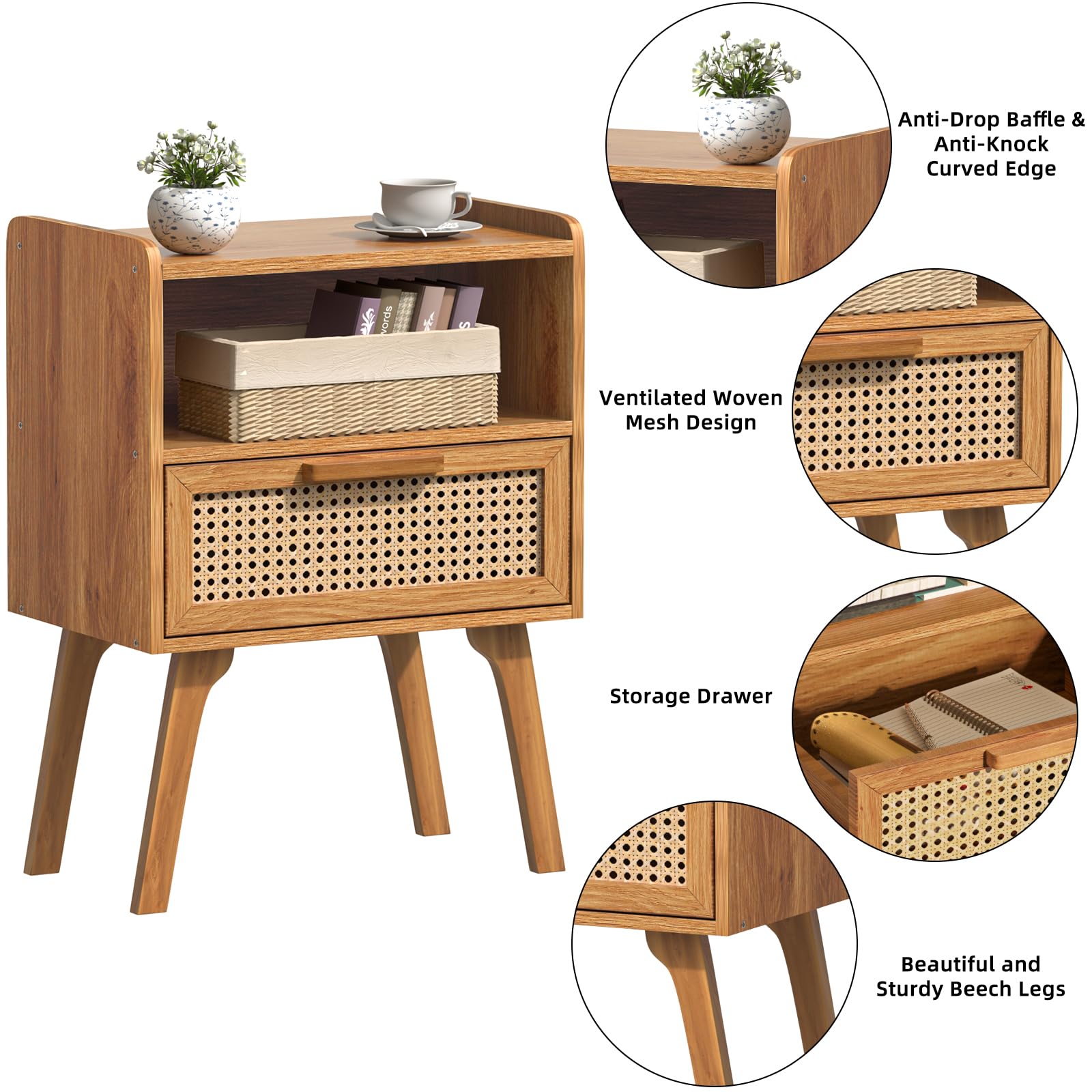 [Large Storage Space and Reliable Material] Spacious table top, woven mesh drawer and open shelf can meet your storage needs. The natural wood nightstand is made of sturdy wood boards and high quality beech legs. Its chic legs also bring a touch of visual appeal. It is reinforced by special screws to ensure its durability and stability, which can accompany you for many years.