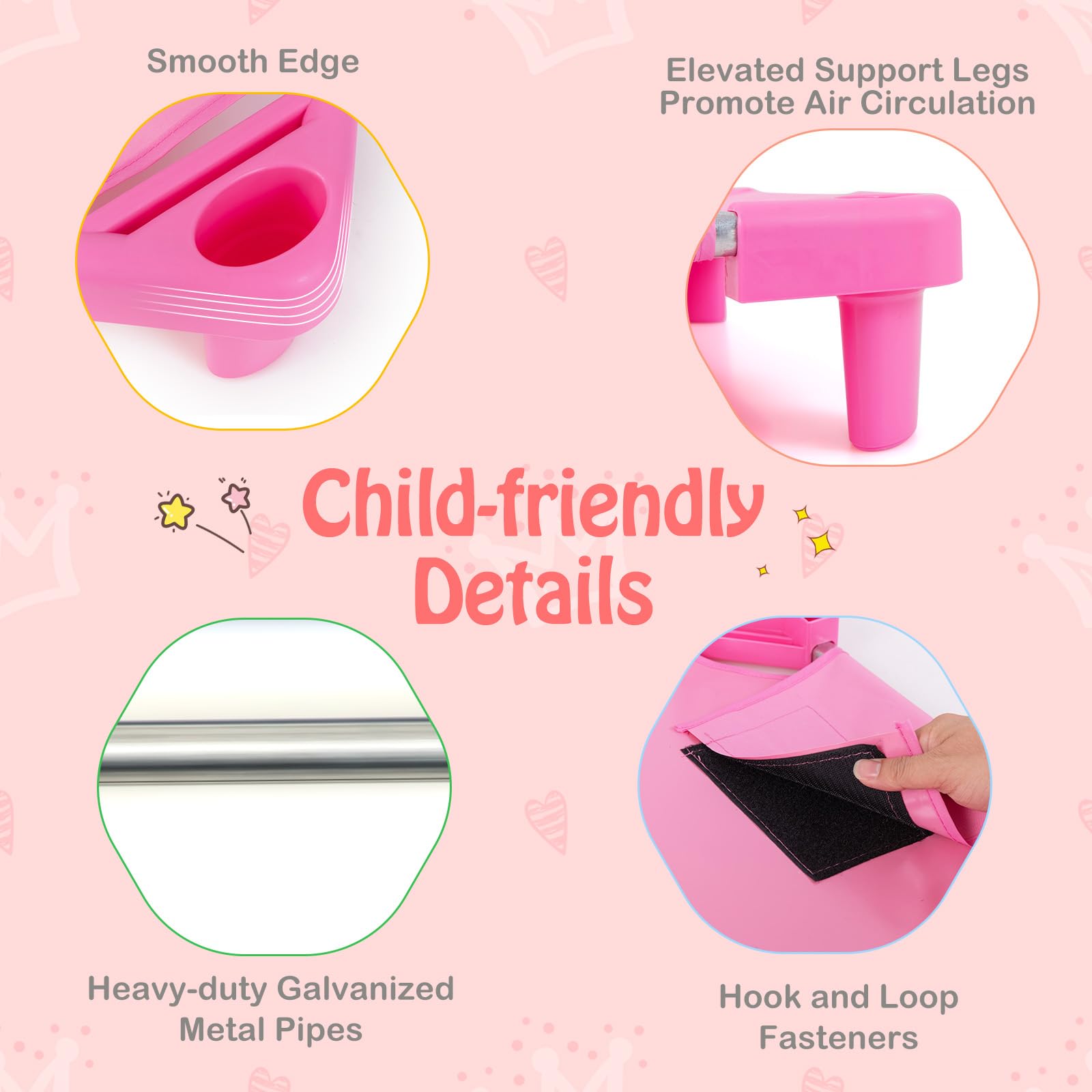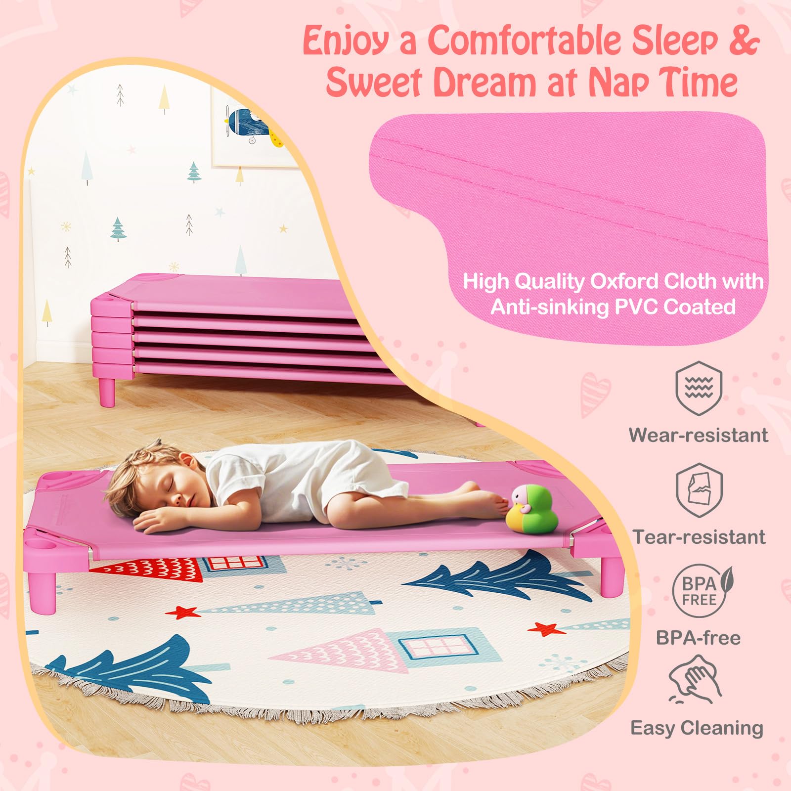 Premium Oxford Fabric: The daycare cots are made of breathable Oxford fabric and feature a wear-resistant netting. The nap cot gently cradles your child, providing a secure and cozy sleeping environment that ensures a peaceful naptime rest.