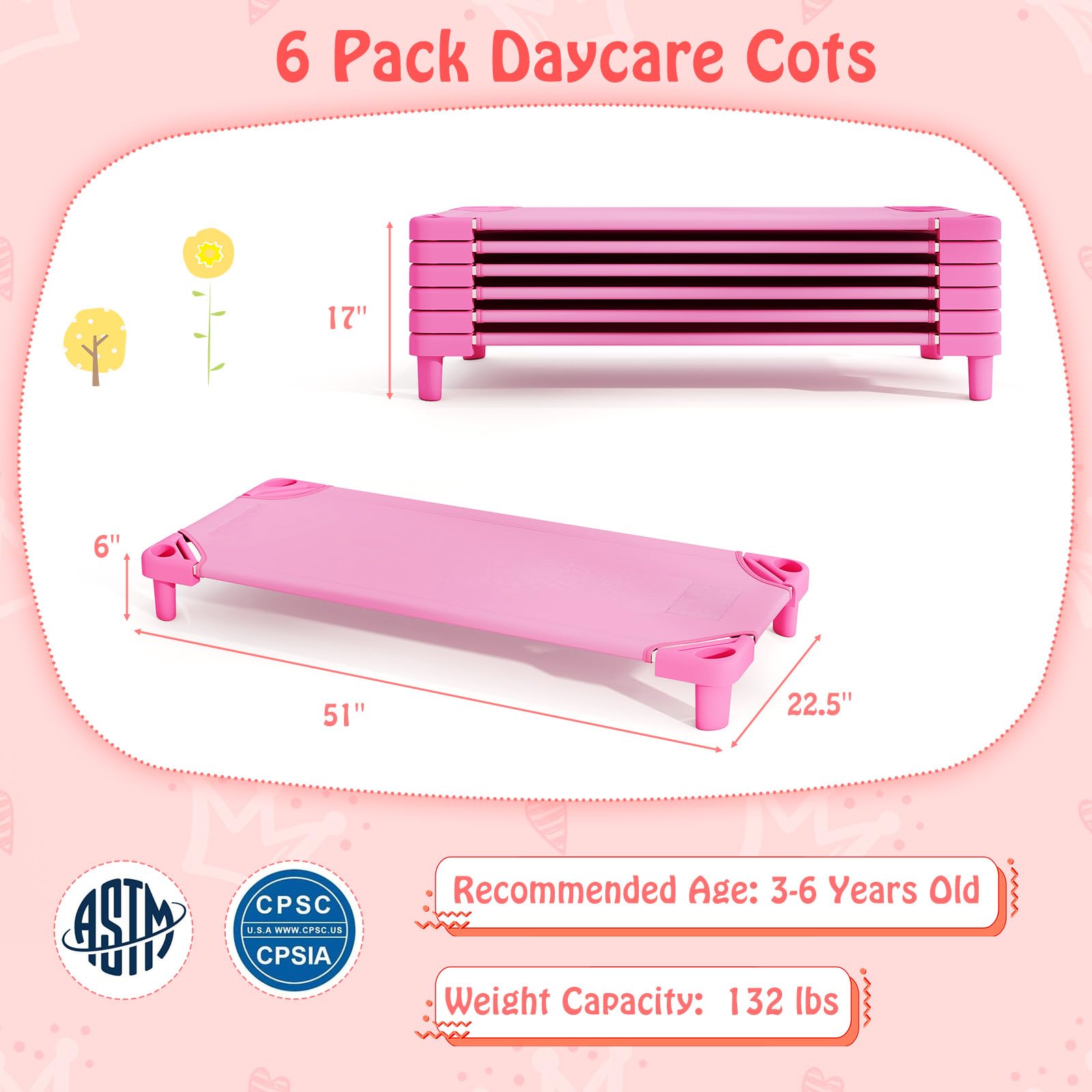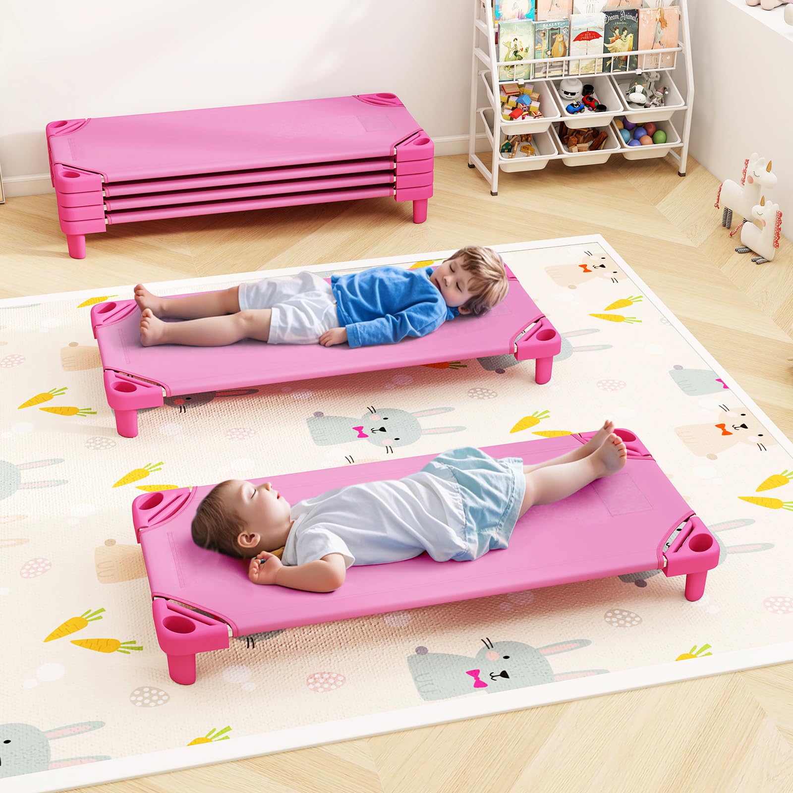 Space-Saving Stacking Design: Perfect for daycare centers, preschools, or even at home, the kiddie cots can be stacked up to 17”. Whether you need to accommodate multiple children in the classroom or simply want to store the cots when not in use, their stackable design makes it easy.