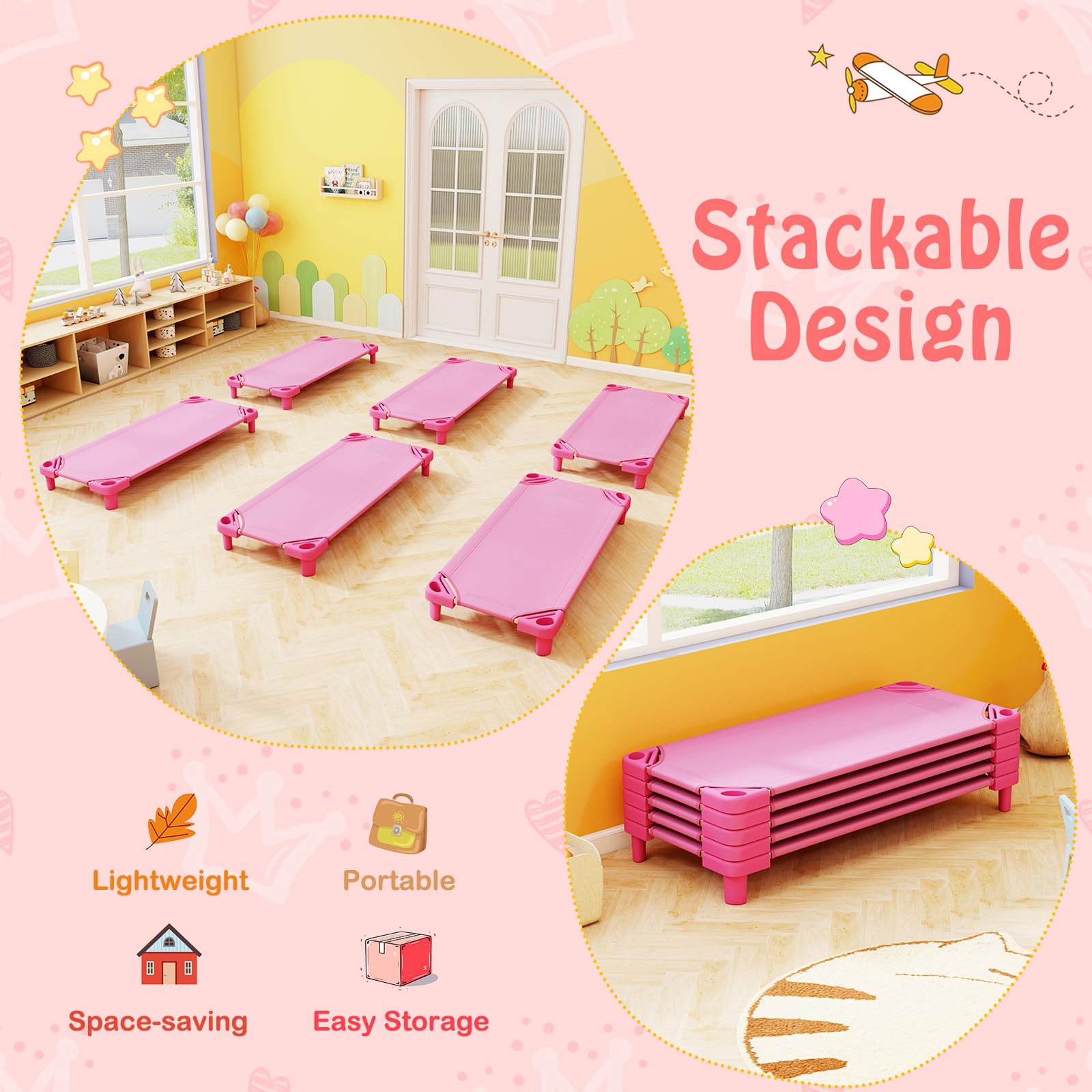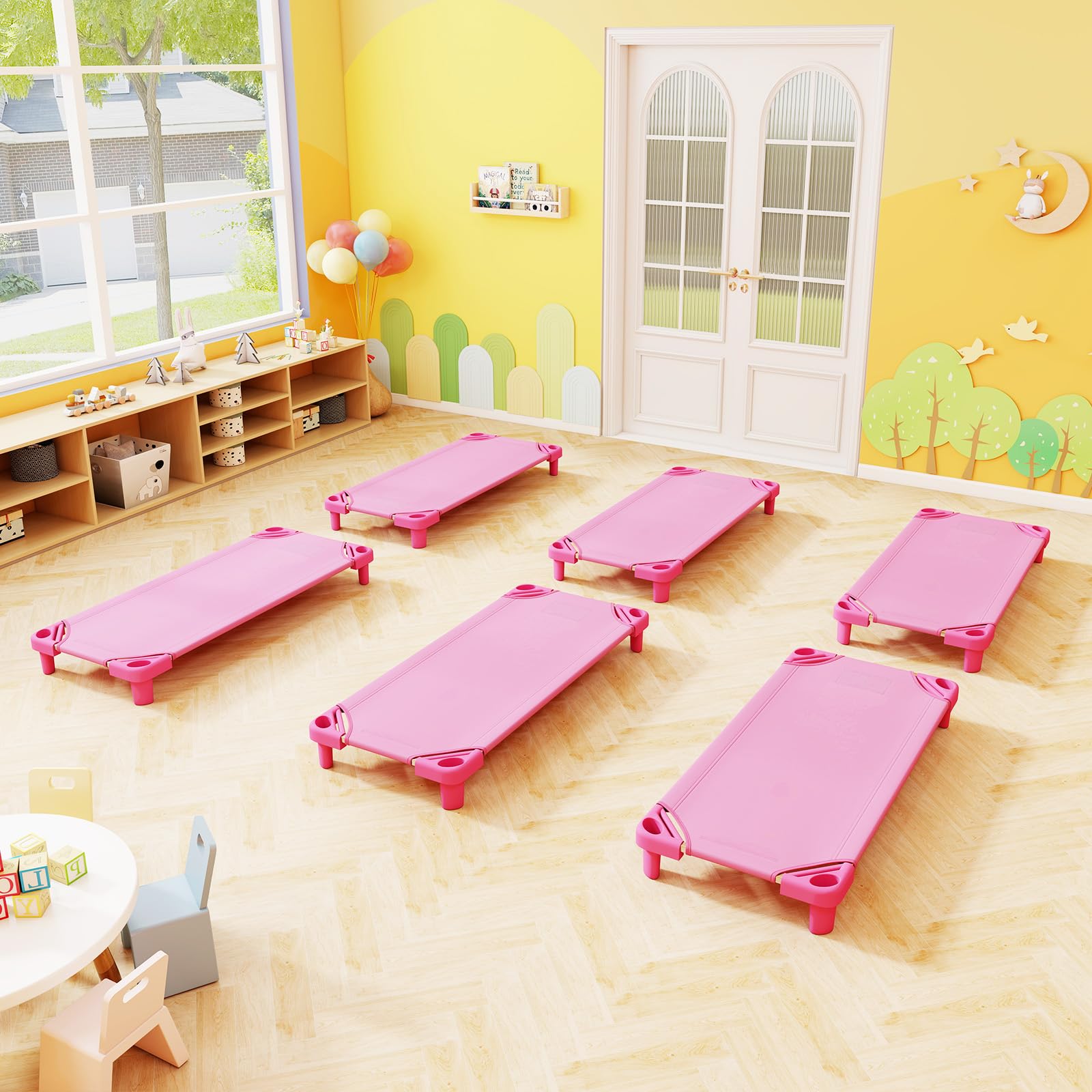 Thoughtful Details: The portable preschool cots are 6” high to keep kids off the floors. Plus, each cot is designed to fit regular-sized crib sheets, making it more convenient for clean-up.