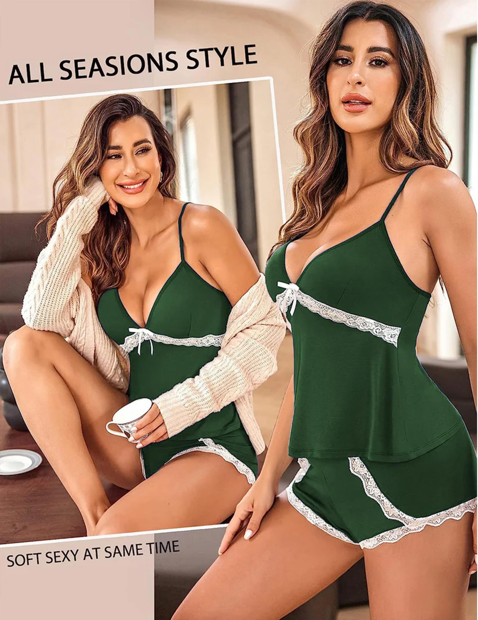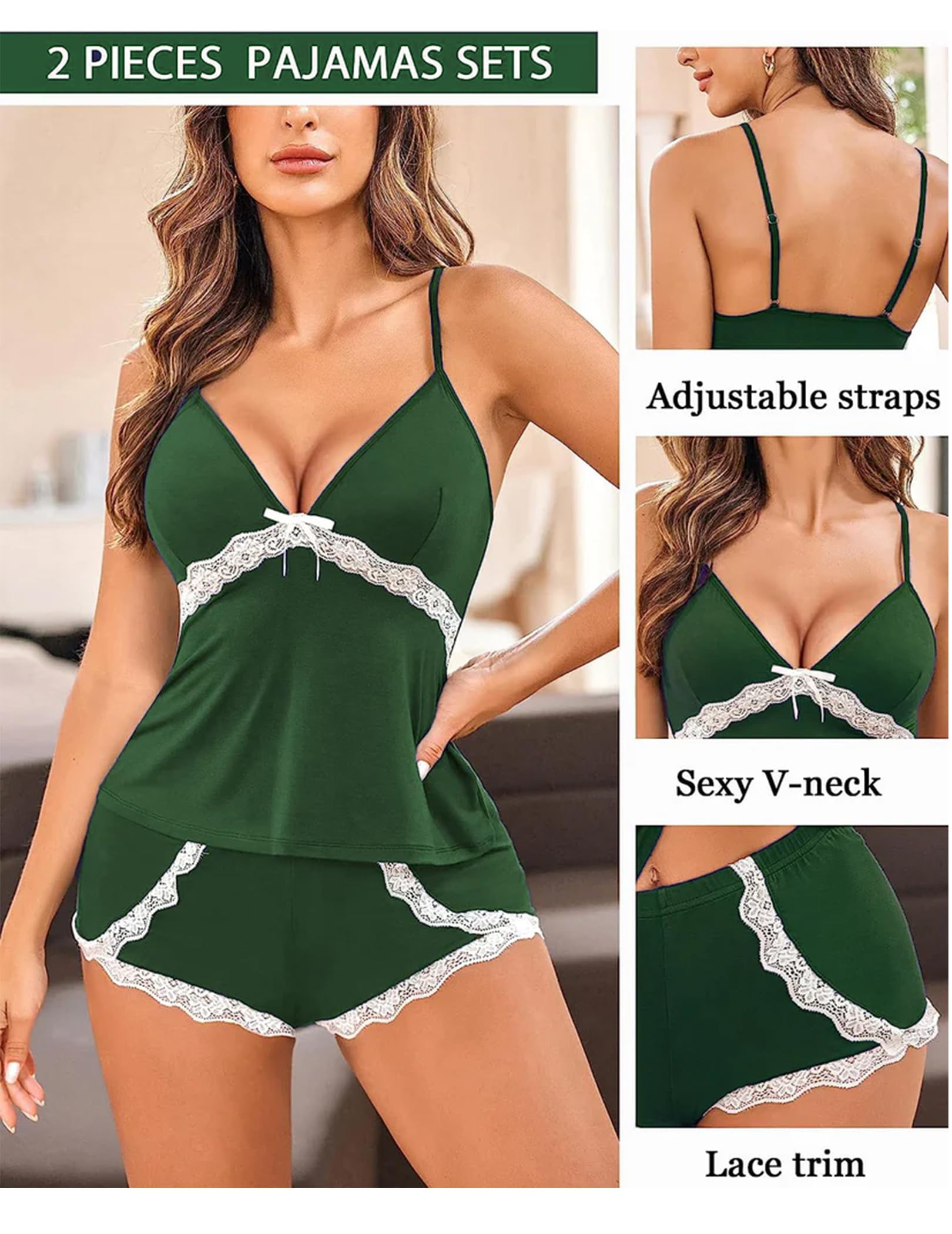 ใCami Pajamas Setใ: Sexy pajamas for women with shorts is designed with v neck and with bow decoration ,adjustable spaghetti strap for easy wearing and adjustment to the comfort position you want, make you comfort, sexy in the night.