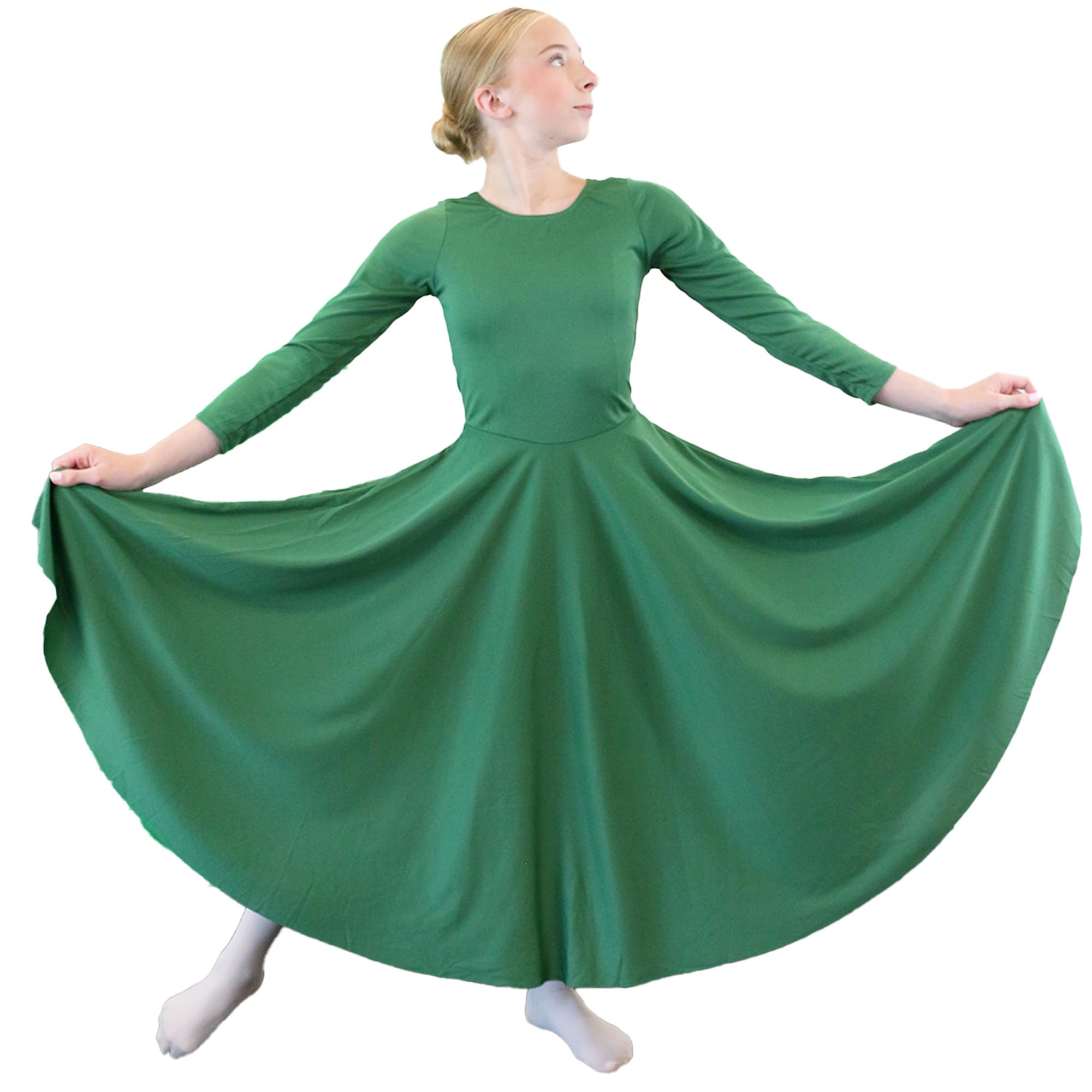 Description This is one of Danzcue's most popular dresses and features a soft and smooth polyester/spandex fabric, breathable, skin-friendly, lightweight, makes you feeling well. The upper torso of this dress is slightly fitted to show the grace and beauty of movement. Fitted in torso, loose in skirt, wide swing, give you enough space to move and give you the best comfort when dancing. The dress features a rounded neckline and long sleeve that allows it to be worn over any top or tunic combination, which is very suitable for worship praise dance, modern liturgical dance, ceremonies, etc. Sell by US Company.