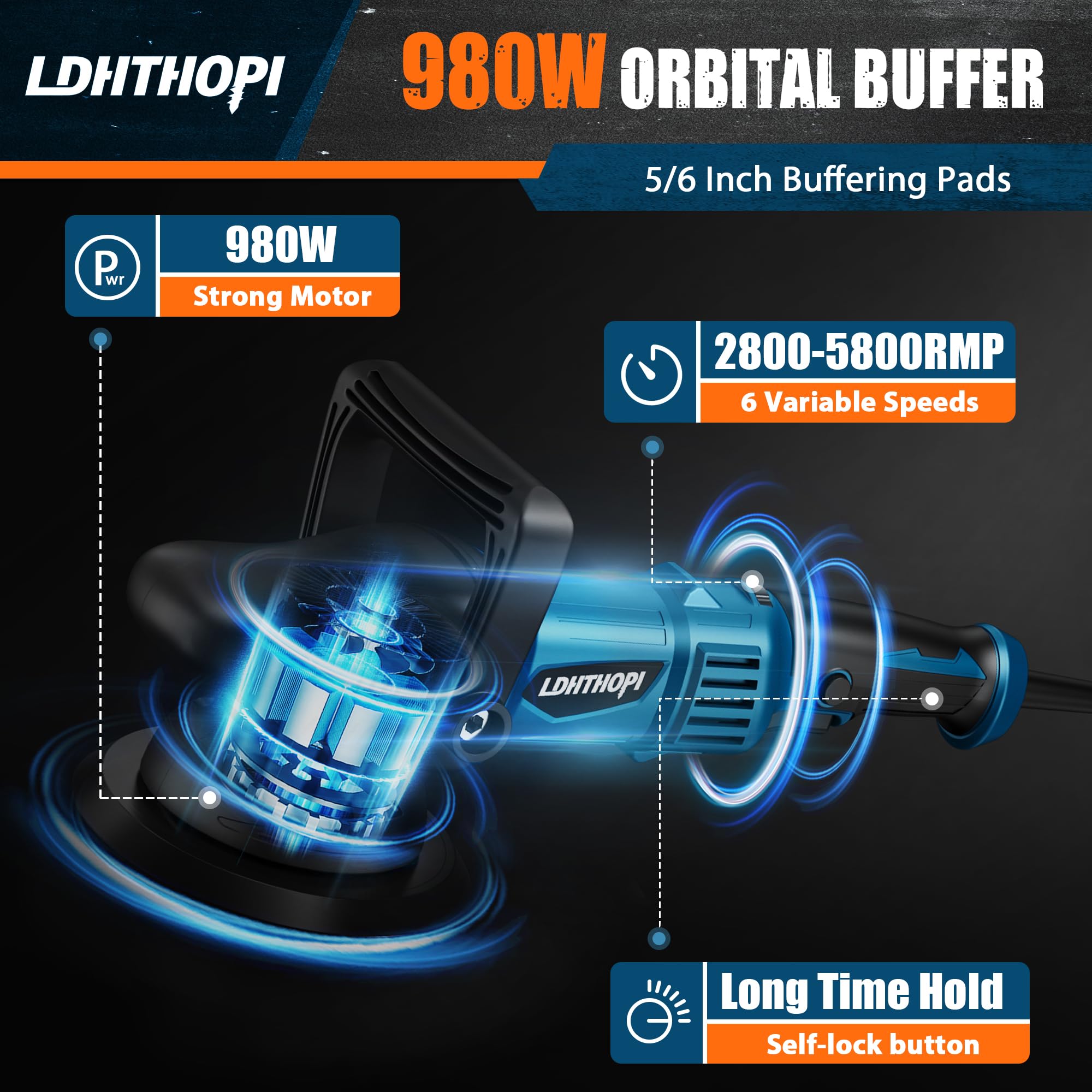 【Variable Speed Control】Buffer polisher with 6 variable speed allows you to change the car polisher’s speed in different applications and materials. Adjust your speed fluently from 2800 to 5800 RPM.